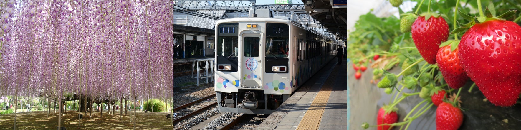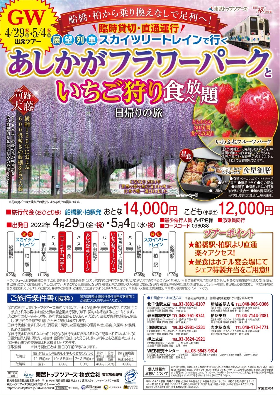 このツアーは、ふだん直通列車の設定が無い船橋・柏方面から足利・佐野方面へ「スカイツリートレイン」を貸切で往復利用し、同地域へ乗換なしで行く日帰りツアーです。「奇跡の大藤」とも言われる樹齢150年、600畳敷きの藤棚を持つ大藤をはじめ、さまざまな藤の花が咲くあしかがフラワーパークを訪れるとともに、いわふねフルーツパークではいちご狩りを体験。とちおとめ等の完熟したいちごを30分間食べ放題でお楽しみいただけます。旅行代金は船橋駅・柏駅発着ともにお1人様大人14,000円、小学生12,000円。千葉県方面にお住まいの方、ゴールデンウィークにご家族やご友人とのお出かけをご検討されている方は、この機会にぜひご利用下さい。