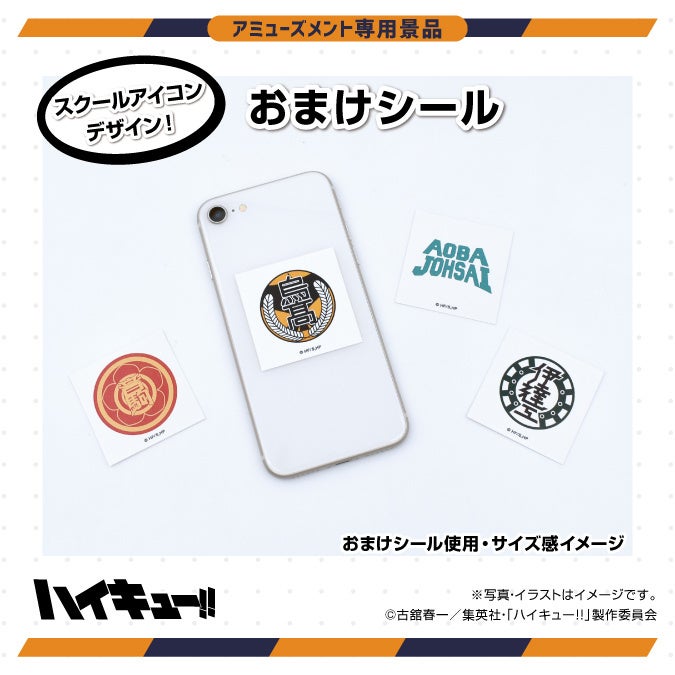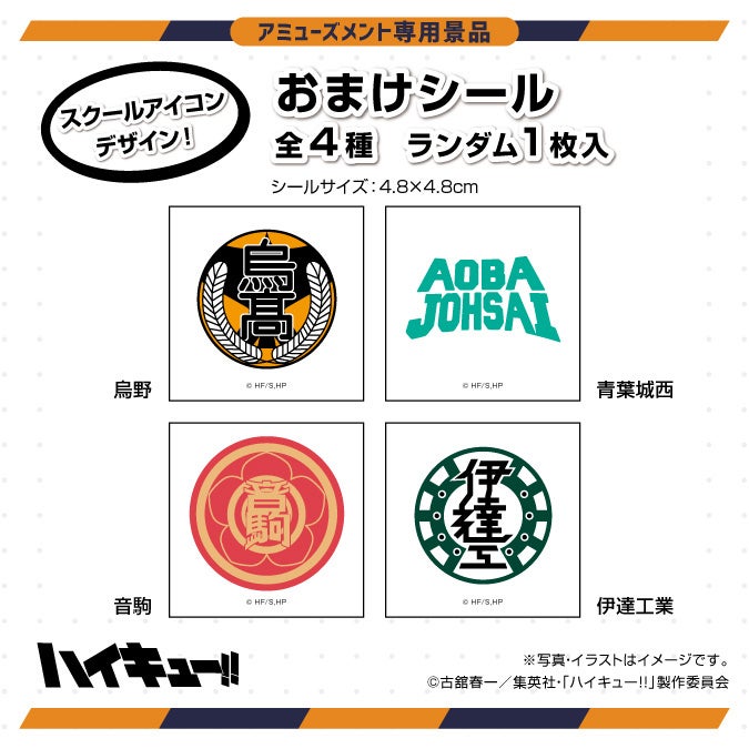 烏野、青葉城西、音駒、伊達工業の4校いずれかのスクールアイコンデザインのおまけシールがランダムで1枚入。