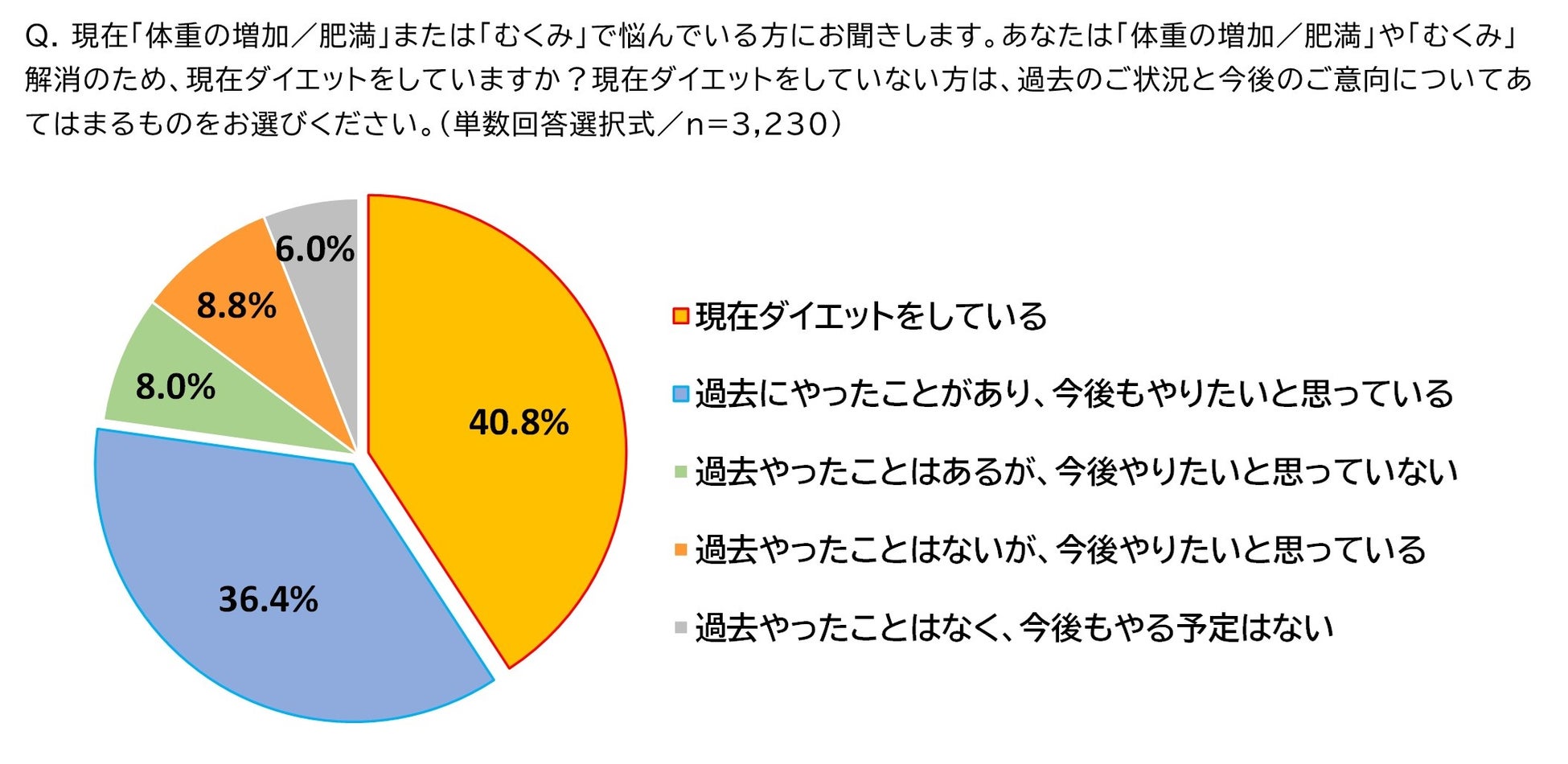 「体重の増加/肥満」または「むくみ」で現在悩んでいると回答した方を対象に、ダイエットをしているか尋ねたところ、約4割が現在もしていると回答しました。また「過去にやったことがあり、今後もやりたいと思っている」と回答した方は36.4%に上り、ダイエットニーズの高さがうかがえる結果となりました。