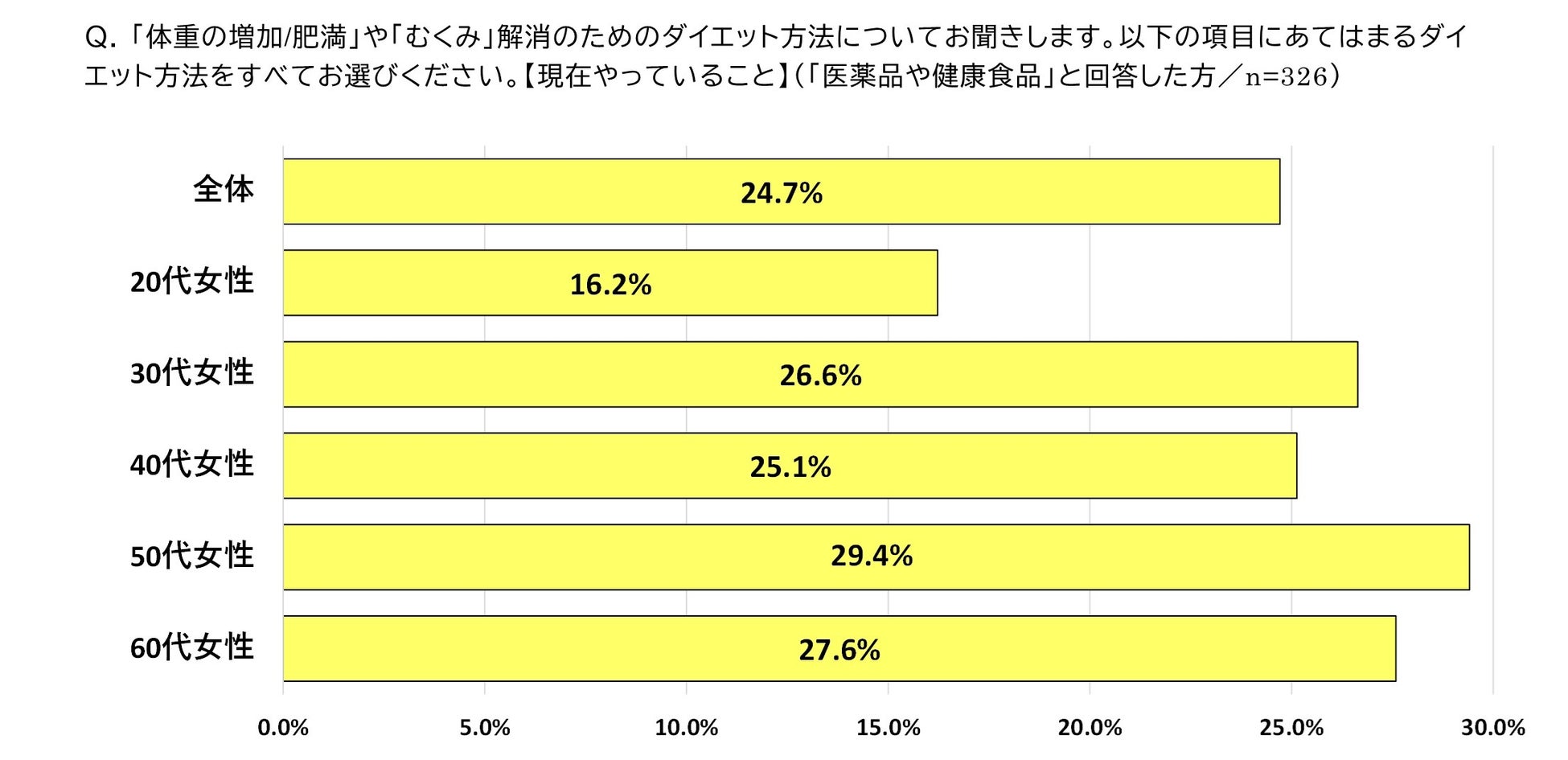 また前述の質問について、「医薬品や健康食品」によるダイエットを行っていると回答した方を年代別に見てみると、20代女性は16.2%と少ないものの、30代以降から増加傾向にあることが分かります。