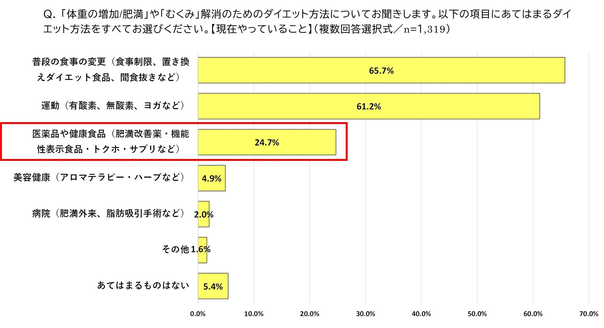 続いて「体重の増加/肥満」または「むくみ」で現在悩んでいると回答した方で、「現在ダイエットをしている」と答えた方に、取り組んでいるダイエット法を尋ねました。「普段の食事の変更」や「運動」などの、一般的なダイエット法に取り組んでいる方が6割を超えた一方で、「医薬品や健康食品」と答えた方も24.7%に上る結果となりました。