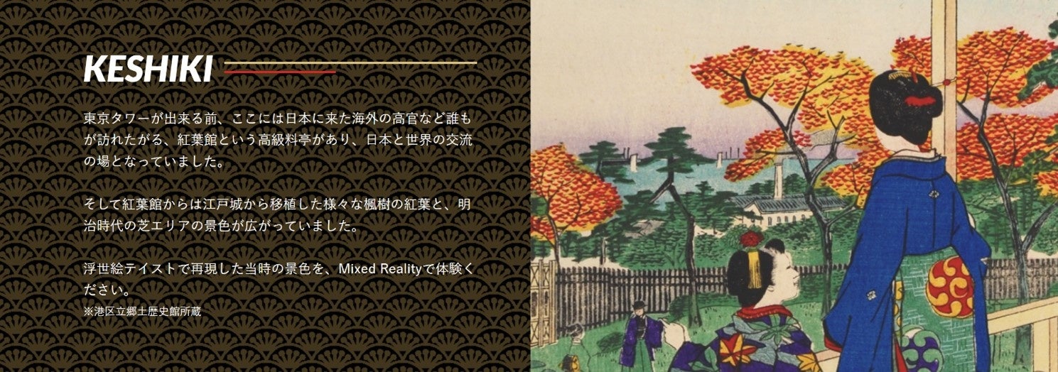 “KESHIKI”コンテンツでは、日本発のXRスタートアップであるSTYLY社(https://styly.inc/)とコラボレーション。東京タワーができる前に現在の東京タワーの場所にあった高級料亭”紅葉館”と、そこから見た明治時代の芝の景色を浮世絵テイストで再現。XRヘッドセットを用いてその世界を体験いただきます。東京タワーが65周年を迎える中、同じ場所に65年間存在した”紅葉館”にフォーカスし先端テクノロジーで当時を蘇らせた、スペシャルコンテンツです。