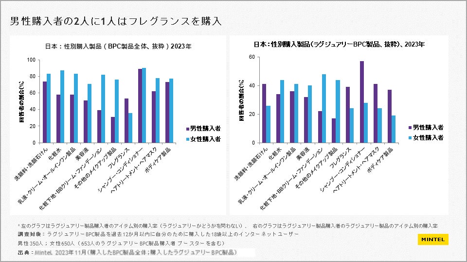 情報の出典元として【ミンテルジャパンレポート『男性の美容とグルーミング・トレンド – 日本 – 2024年』『ラグジュアリー&プレミアム BPCトレンド – 日本 – 2024』『ジェンダーレスビューティ – 日本 – 2023年』より】の明記をお願いいたします。