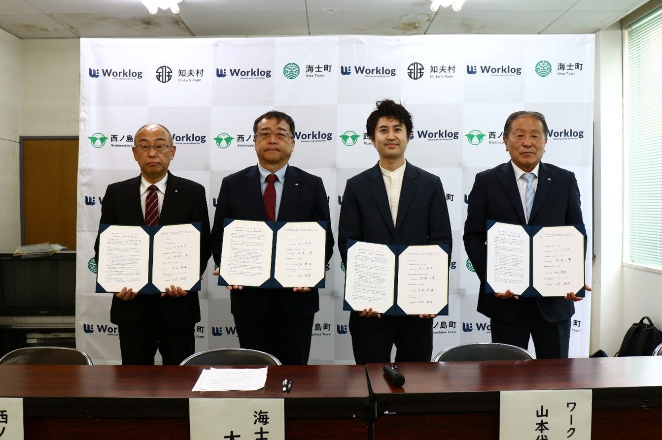 島根県海士町(島根県隠岐郡海士町大字海士1490番地、町長:大江和彦)、西ノ島町(島根県隠岐郡西ノ島町大字美田600番地4、町長:坂栄一秀)、知夫村(島根県隠岐郡知夫村1065番地、村長:平木伴佳)とワークログ株式会社(東京都千代田区九段北1-2-2 グランドメゾン九段 805、代表取締役:山本純平)は、住民生活の向上、地域経済の活性化、行政サービスの効率化などを目的として、令和7年3月25日(火)に地域情報化・DX推進に係る連携協定を締結しました。