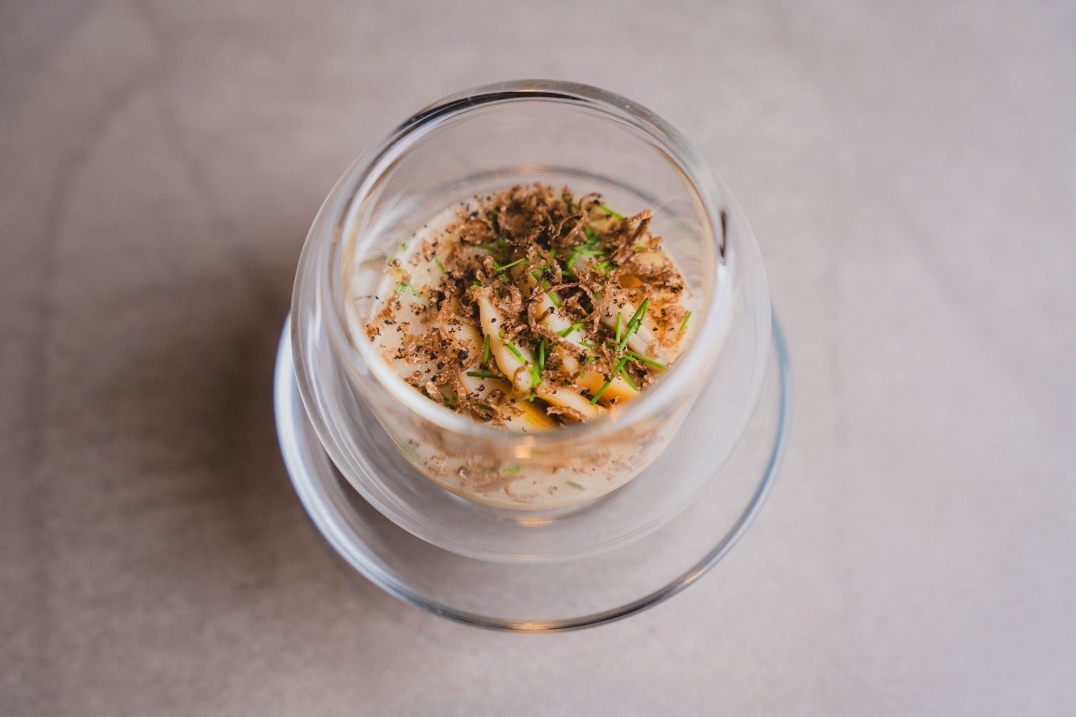 軽くローストしたレアのホタテと150度で2時間じっくり火入れしたとろとろのカブを使った口当たりがよい冷菜。新鮮な魚介類を薄切りにして提供する韓国刺身料理の「フェ(회)」を和の要素を取り入れアレンジした一品です。