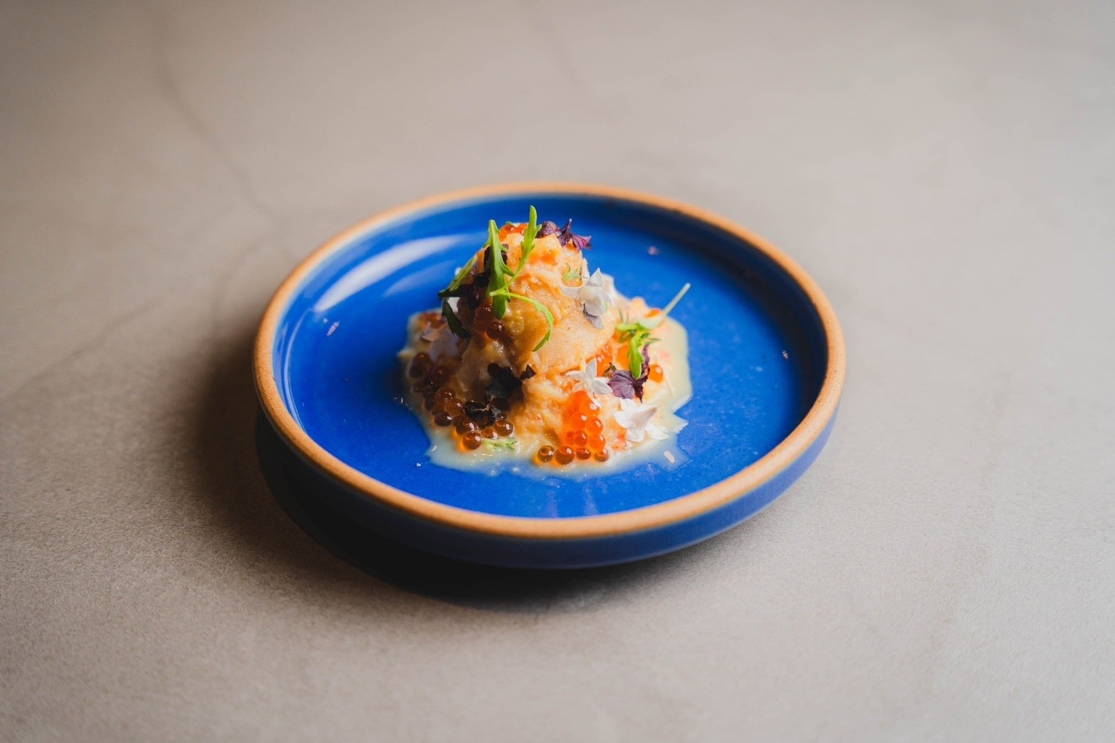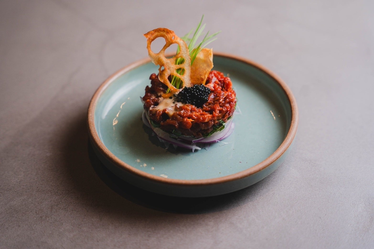 旬の高級魚である新鮮なとらふぐを使用した贅沢なユッケ。ふぐの繊細な味わいとユッケの甘辛いタレが絶妙にマッチします。とらふぐの身は弾力があり、層になった赤玉ねぎのスライスやレンコンチップスの食感とぷりぷりとした歯ごたえのコントラストが楽しめます。