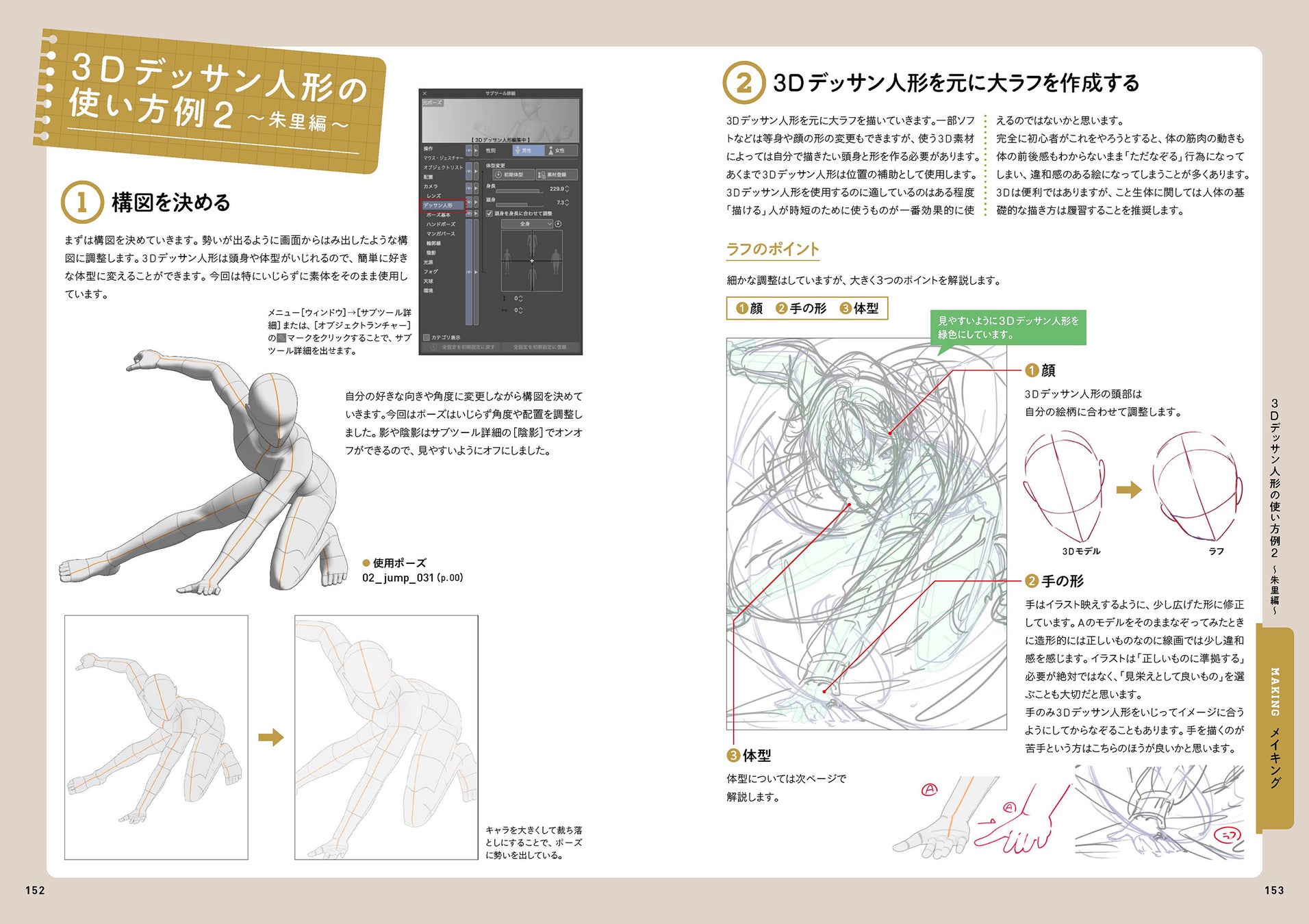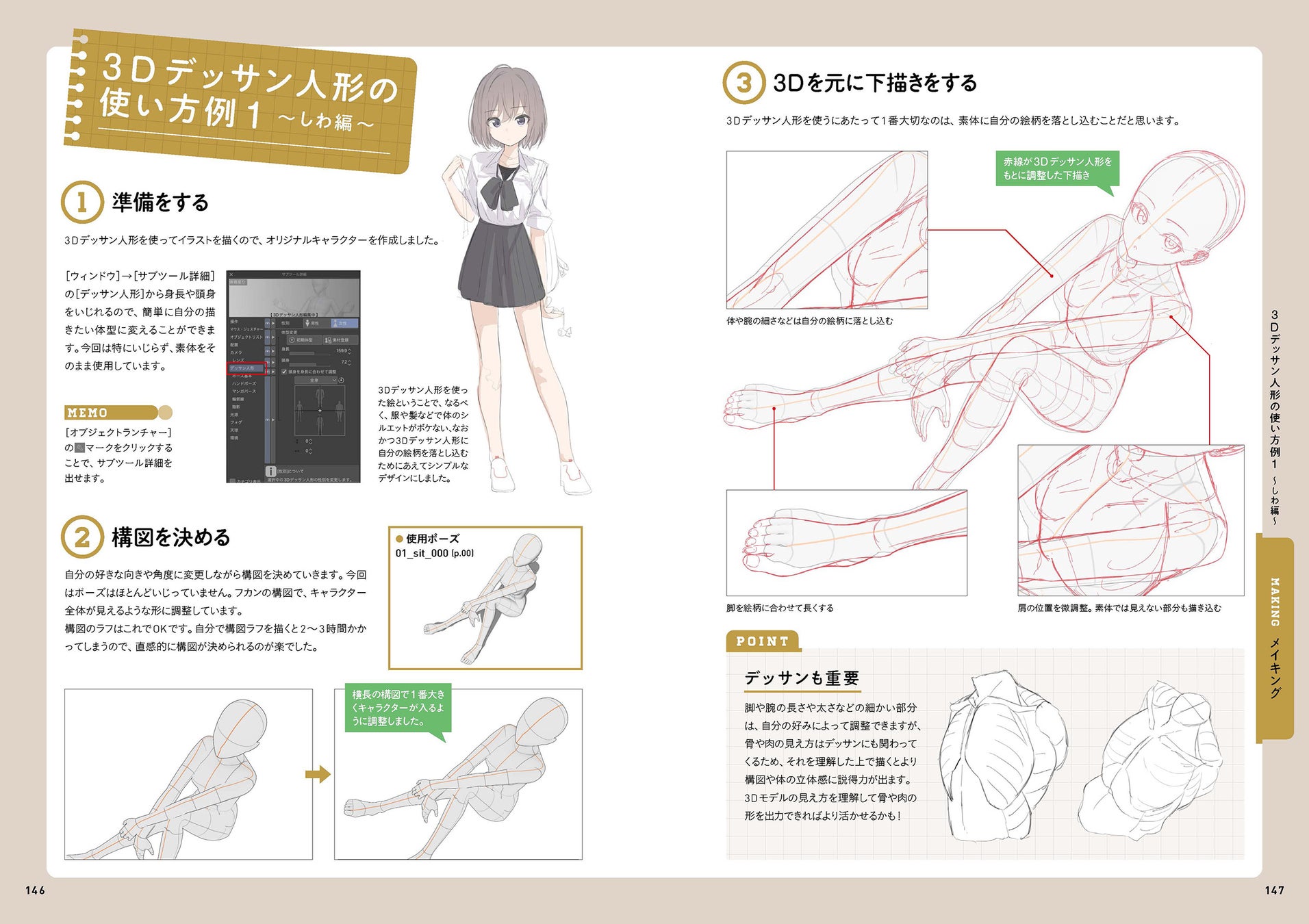 巻末には、イラストレーター「朱里」「しわ」による3Dデッサン人形の活用事例を掲載。