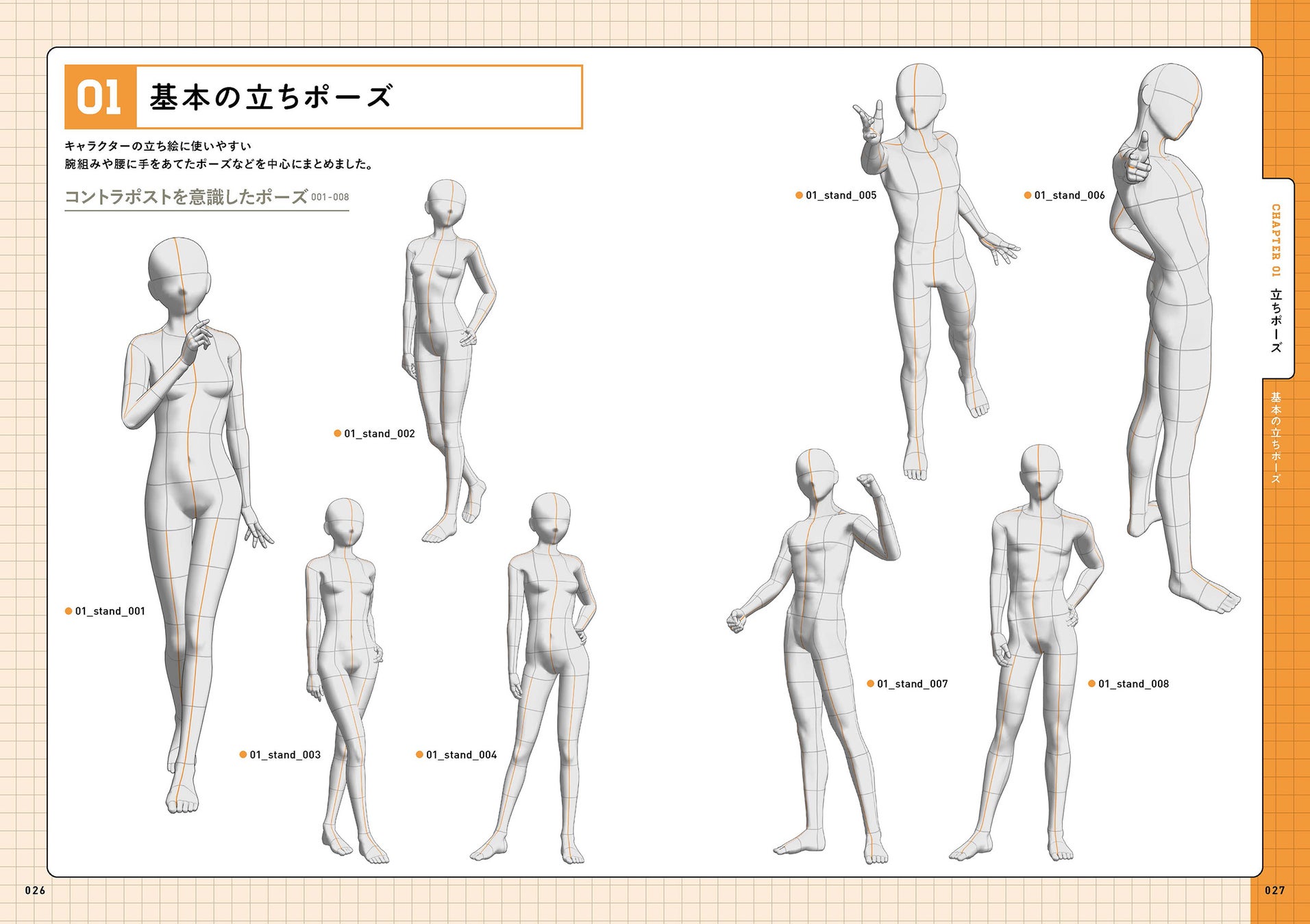 本書収録のポーズ素材は、描きたい構図に合わせて360度アングルを自由自在に変更でき、描きたいキャラクターに合わせて体型や性別を好きに変更できます。