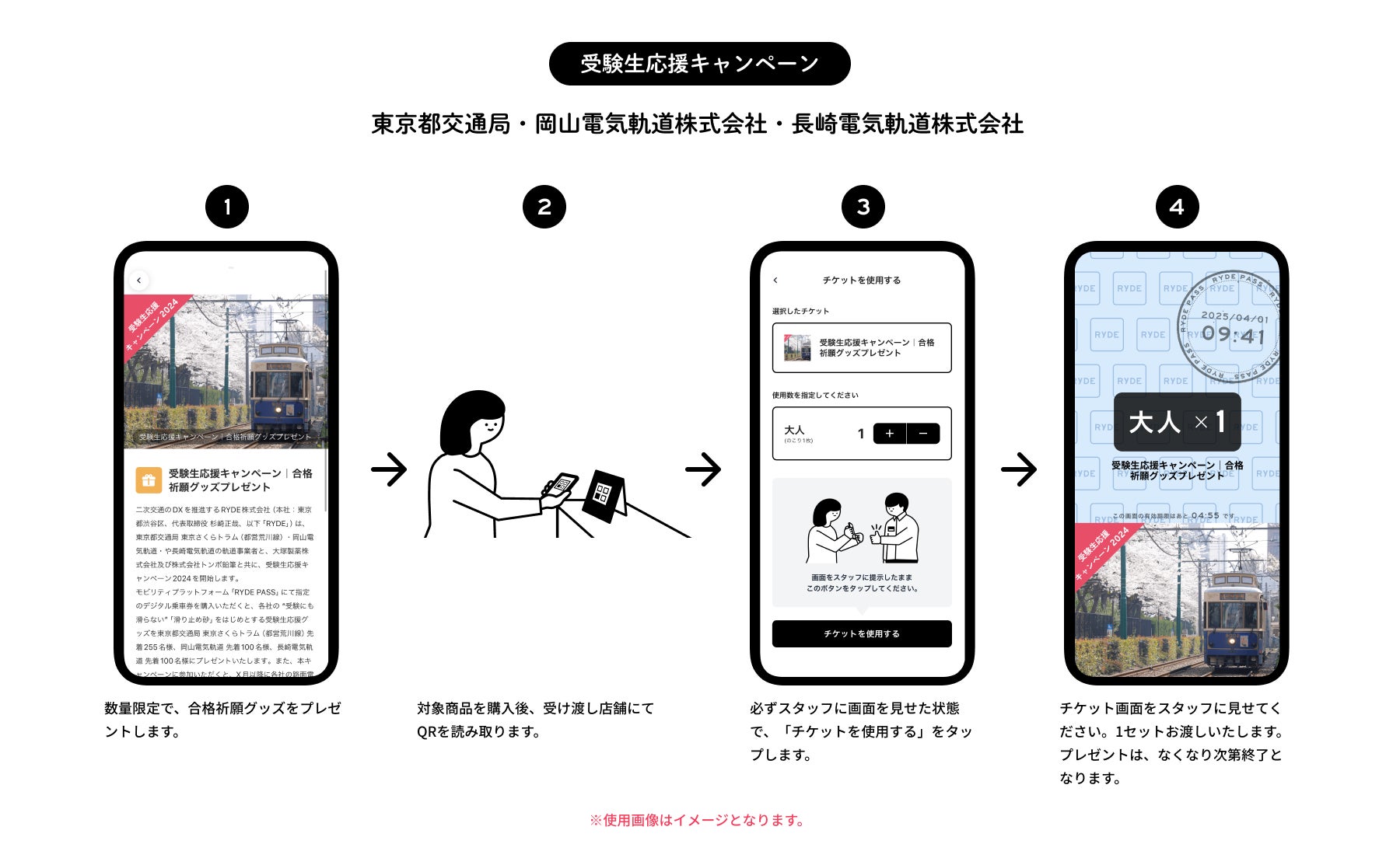 二次交通のDXを推進するRYDE株式会社(本社:東京都渋谷区、代表取締役 杉崎正哉、以下「RYDE」)は、東京都交通局 東京さくらトラム(都営荒川線)・岡山電気軌道・長崎電気軌道の軌道事業者と、大塚製薬株式会社及び株式会社トンボ鉛筆と共に、受験生応援キャンペーン2024を開始します。モビリティプラットフォーム「RYDE PASS」にて指定のデジタル乗車券を購入いただくと、各社の “受験にも滑らない” 「滑り止め砂」をはじめとする受験生応援グッズをプレゼントいたします。また、本キャンペーンに参加いただくと、2025年4月以降に各社の路面電車に相互でお得に乗車できるクーポンもご用意しています。今冬の受験シーズンから春まで受験生に伴走し、皆さんの合格を心より応援します。