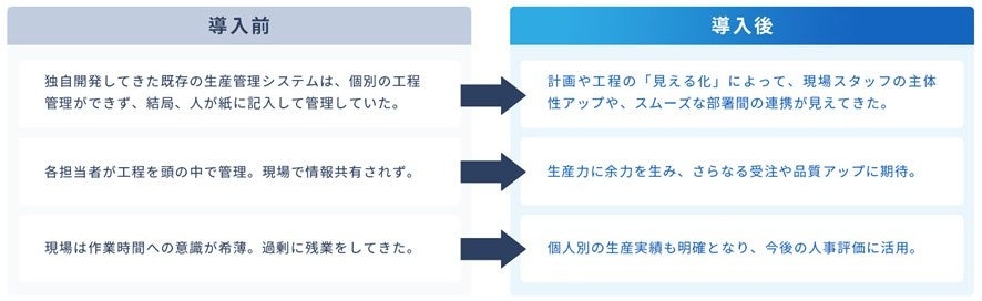 ✔計画や工程の「見える化」によって、現場スタッフの主体性アップや、スムーズな部署間の連携が見えてきた。