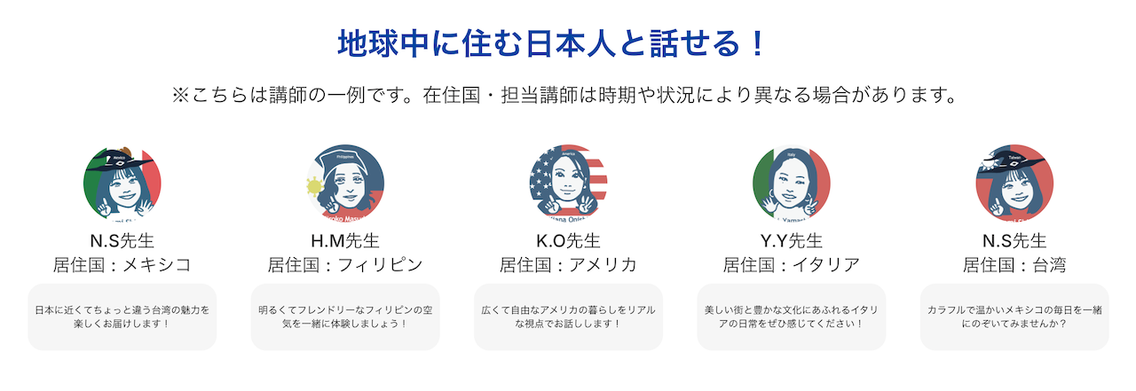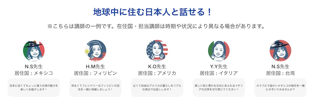 本サービスの講師は、ネイティブスピーカーではなく、実際に海外で生活し、異文化の中で挑戦を続ける日本人です。子どもたちは、同じ日本人が世界各国で活躍する姿を目の当たりにすることで、「自分も世界で生きられるかもしれない」という具体的なイメージを持つことができます。