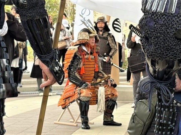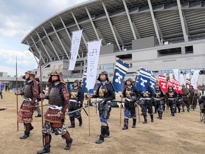総大将の横山 雄二アナウンサー(RCC)率いる一行は、正午にひろしまゲートパークを出発。大将姿の久保 竜彦氏(元 サンフレッチェ広島)が待つひろしまスタジアムパークを練り歩き、ペデストリアンデッキを経て広島城三の丸へ。武家茶道 上田宗箇流 若宗匠の上田 宗篁氏による御点前で一服したのち、広島護国神社を正式参拝。さらに広島城本丸では安芸ひろしま武将隊と、広島城のキャラクター しろうニャが登場。全員で高らかにかちどきの声を上げ、始まりの日を祝しました。