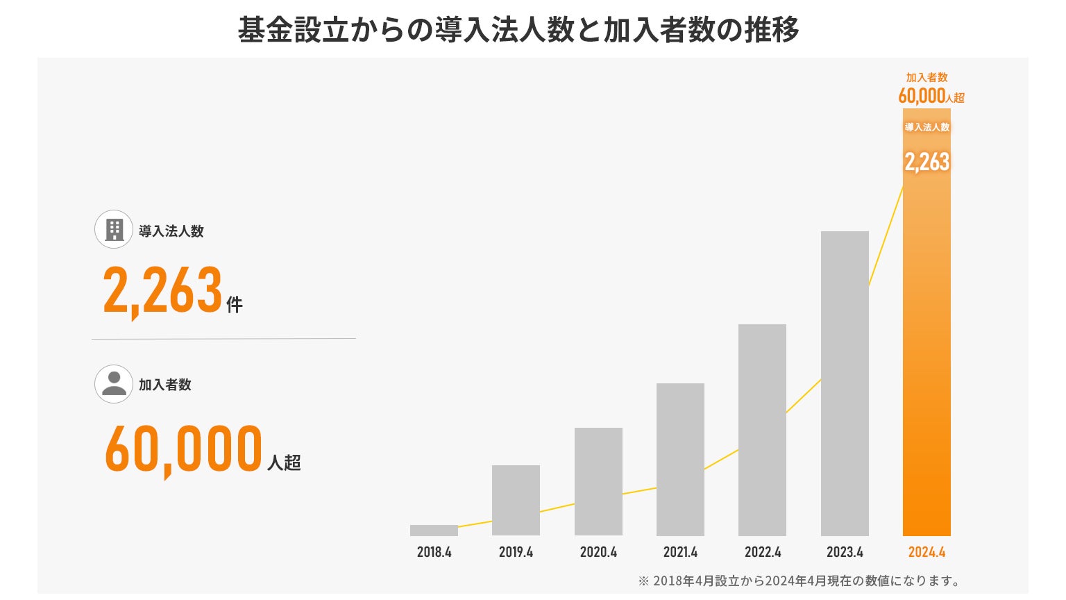 「はぐくみ企業年金」は、主に福祉業界で働く方の将来の資産形成を支援することを目的として、確定給付企業年金法に基づき発足した企業年金基金です。保育・介護等を含めた計6の業界団体から推奨基金として認定されているほか、大手地方銀行をはじめとした金融機関との業務提携を強化しており、福祉業界にとどまらず全国の中小企業に導入いただいております。基金設立から6年で、導入法人数2,263、加入事業所数2,606*、加入者数67,180人(2024年4月末現在)と、ともに拡大を続けており、直近6ヶ月間では約1万人増加しております。