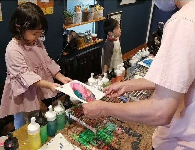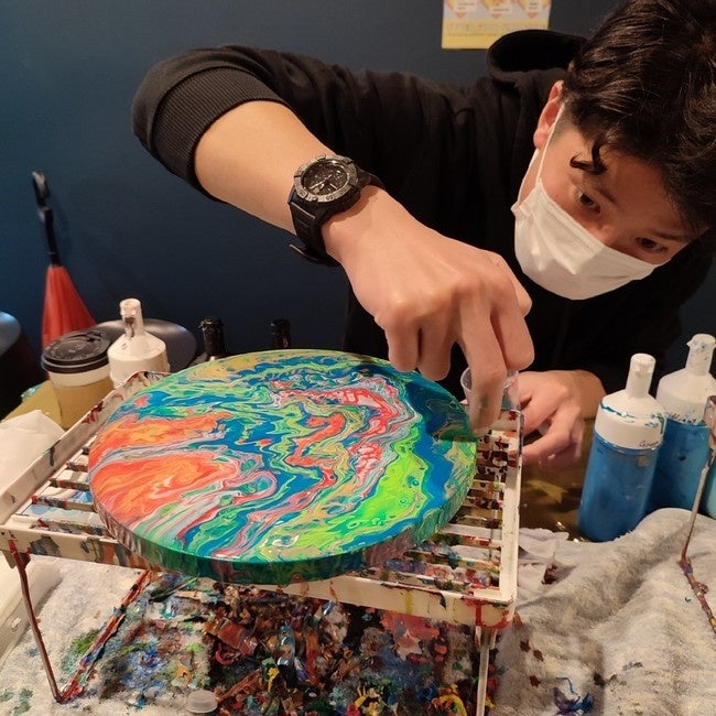 第3回目となる今回は、関東サッカーリーグ1部所属のサッカークラブ「南葛SC」に所属する傍ら、アーティストとしても活動する能登正人さんと、アクリル絵の具の流動性を使って描く「ポーリングアート」という種類の絵画を制作します。ポーリングアートは1つとして同じ作品は生まれないため、唯一無二の作品を作り上げることができます。