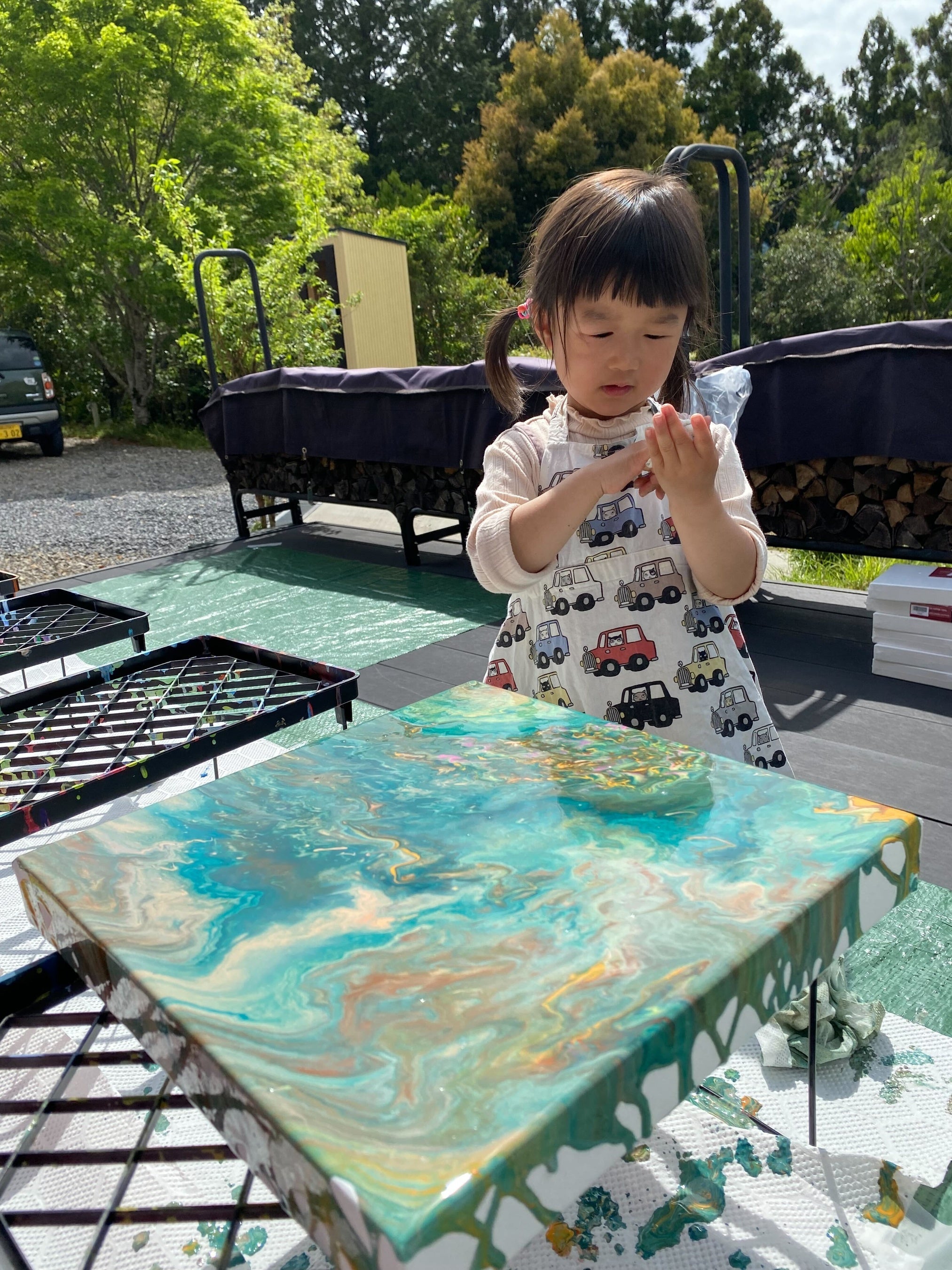 数種類のアクリル絵の具をキャンバスに垂らし、流動性を生かして描く技法。キャンバスを傾けたり、手で絵の具を広げたりして、作品を仕上げます。色同士が混ざり合わないため、美しいマーブル模様が出来上がります。