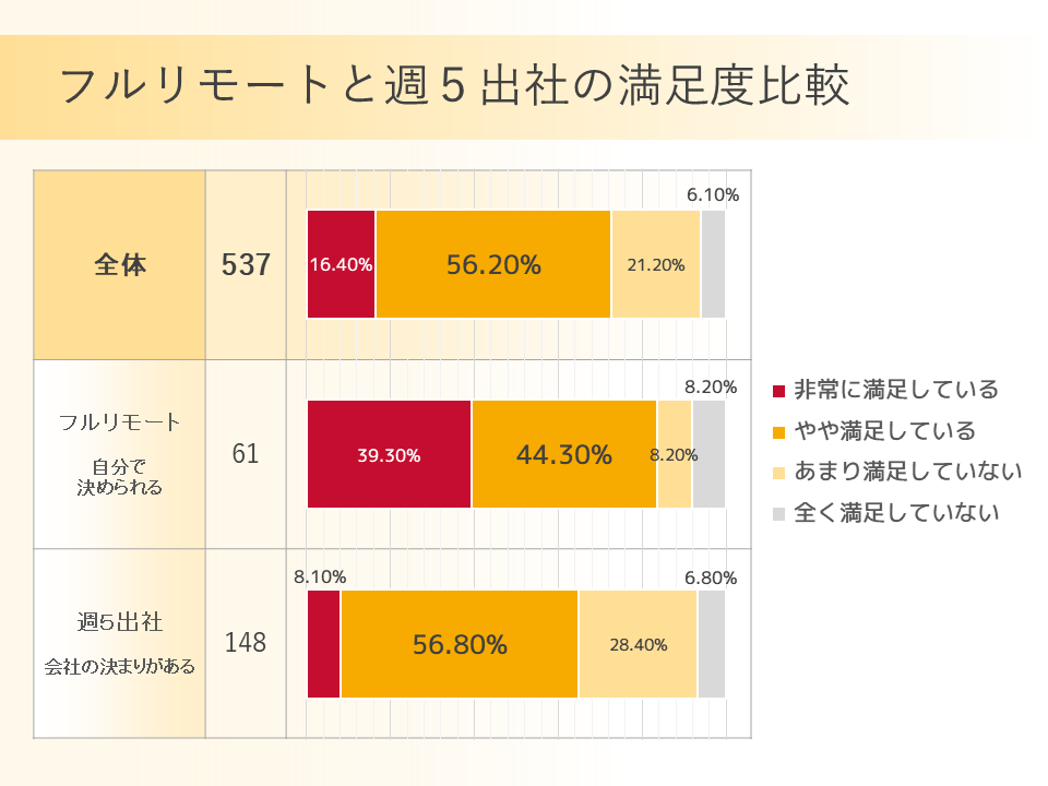 自ら選択してフルリモートをしているエンジニアと、会社の決まりで週5日出社しているエンジニアの満足度を比較してみたところ、「非常に満足している」と答えた割合に30%近くの差があり、「やや満足している」とあわせた「満足している人」の割合も、20%近くの差がありました。