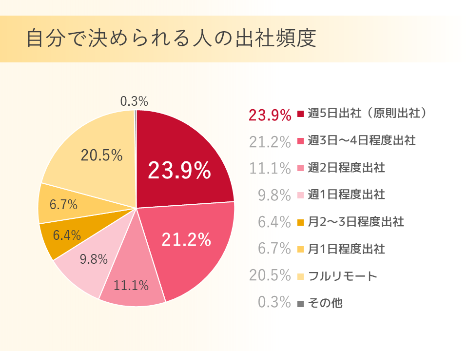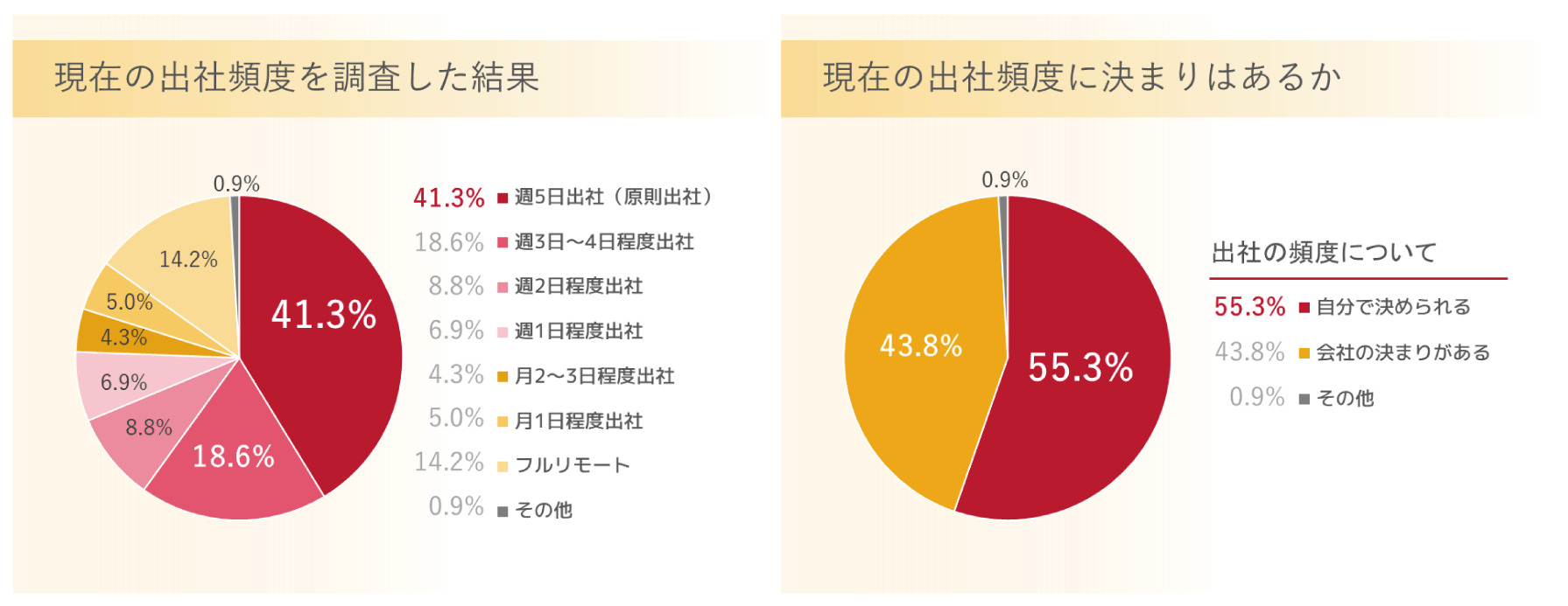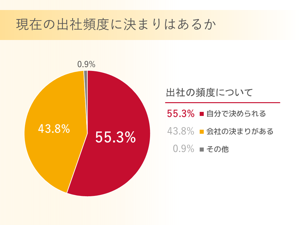 また、約半数以上が出社の頻度を自分で決められるものの、約4割のエンジニアは出社頻度について会社の決まりがあると答えました。
