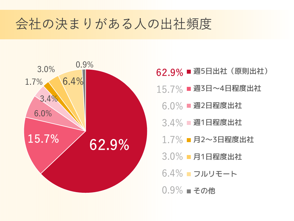 出社の頻度について会社の決まりがあると答えたエンジニアの出社頻度は、約6割が週5出社でした。
