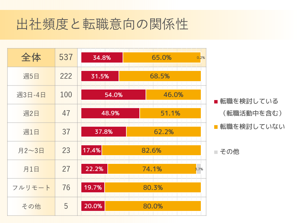また、出社頻度と転職意向の関係性を見ていくと、週1程度以上出社しているエンジニアでは3割から5割近くが転職意向があるのに対し、フルリモートを含む月2〜3程度以下の頻度で出社しているエンジニアは約2割程度と、出社頻度が低いほうが転職意向も低い傾向にあることがわかりました。