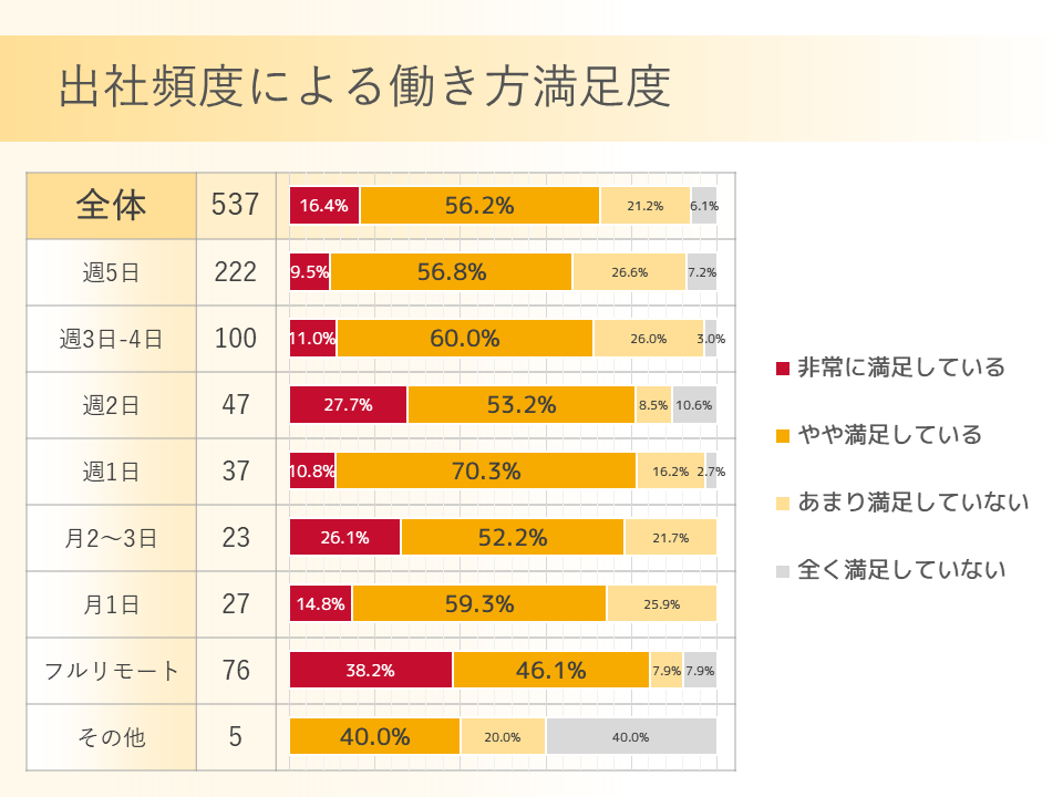 出社頻度による満足度の違いを見ていくと、「フルリモート」のエンジニアの約8割が、「満足している」と答え、なかでも「非常に満足している」と答えた割合が約4割近くに迫っています。