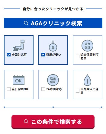 そうした課題を解消するため、「AGAクリニックレビュー」では全国の主要なクリニックの治療プランや価格、診療形式、保証制度などを一目で比較できるサービスを開発しました。ユーザーは、自分の希望条件に合うクリニックを絞り込みながら、納得したうえでクリニックを選ぶことが可能です。