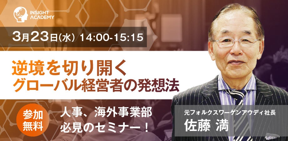 グローバル人材育成・研修業を手掛けるインサイトアカデミー株式会社(本社:東京都港区六本木、代表取締役:北村 嘉章)は、【元フォルクスワーゲンアウディ社長が語る】逆境を切り開くグローバル経営者の発想法《無料アーカイブ動画生配信》を、2022年3月23日(水)14時より開催致します。