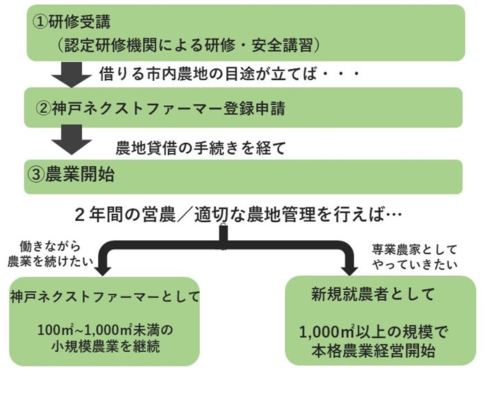 神戸ネクストファーマー制度は新たな農業の担い手「半農半X※」として、兼業でも参画できる程度の研修と農地規模をセットにした点が画期的です。