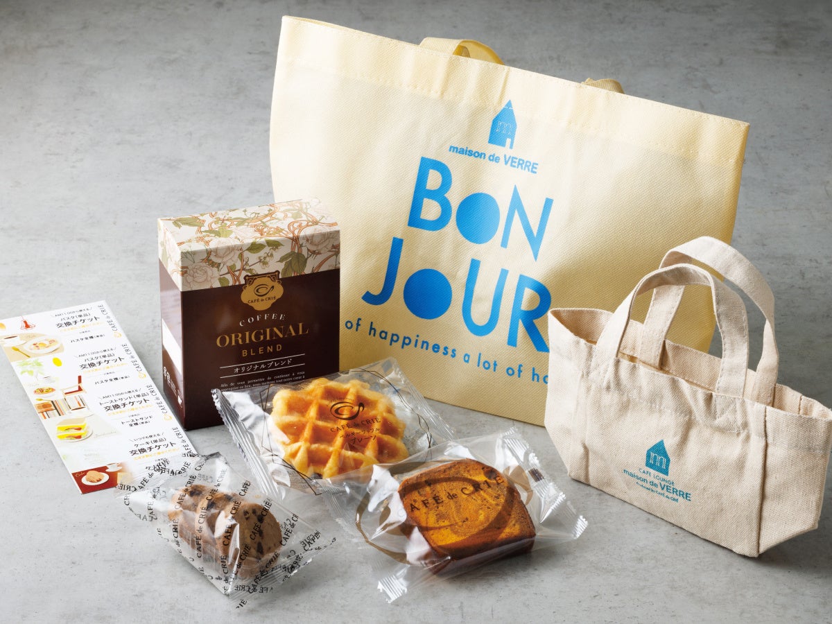今年は全国の『カフェ・ド・クリエ』や姉妹ブランドの『メゾン・ド・ヴェール』で使用できるフード交換チケット(4枚)をはじめ、人気の焼き菓子3種類、ドリップコーヒーオリジナルブレンド1箱(5杯分)、コーヒー粉を使用したサスティナブルなバッグのお得な福袋です。