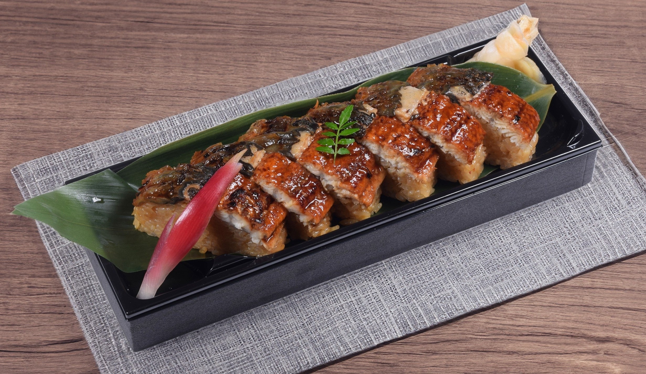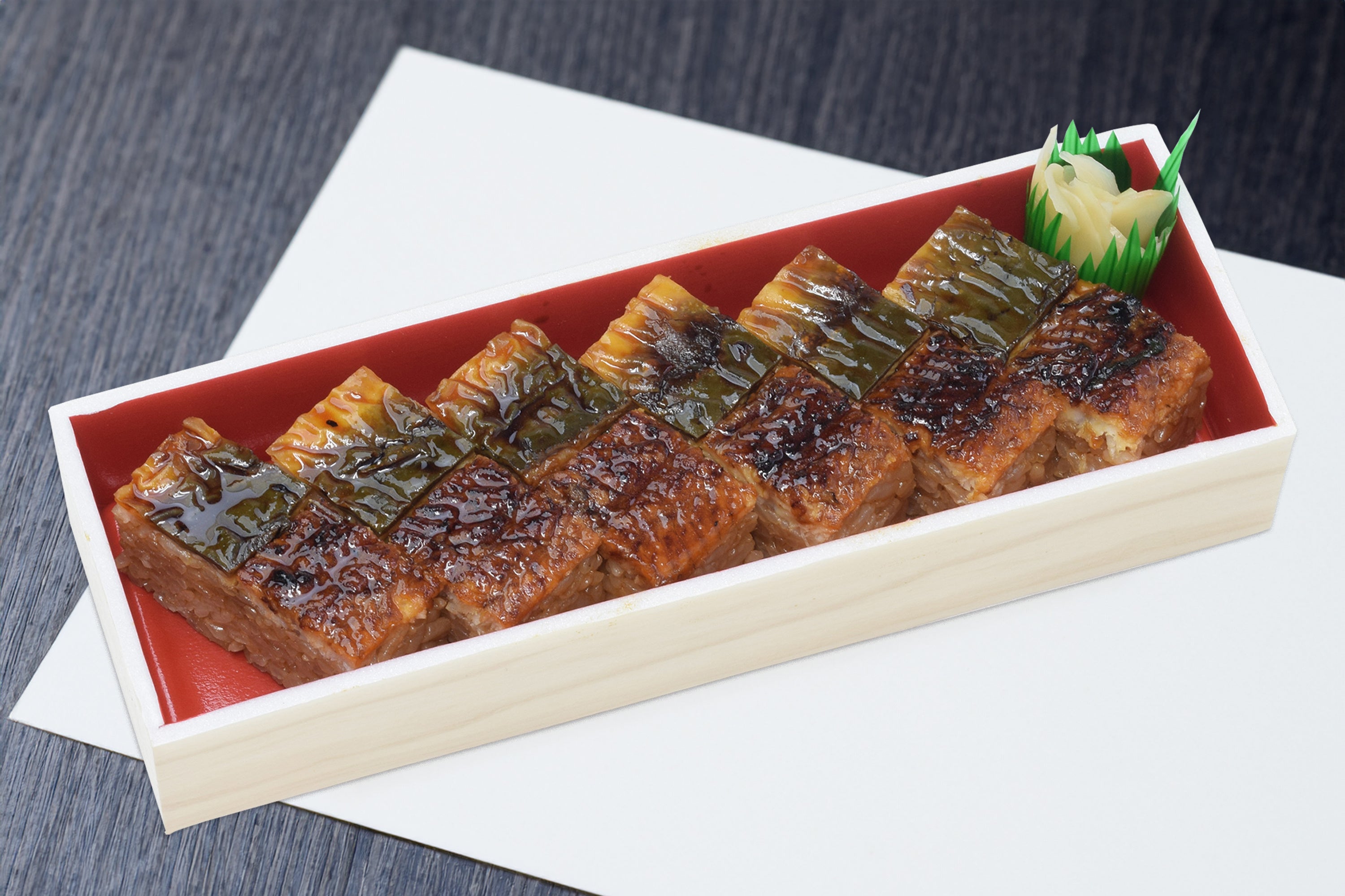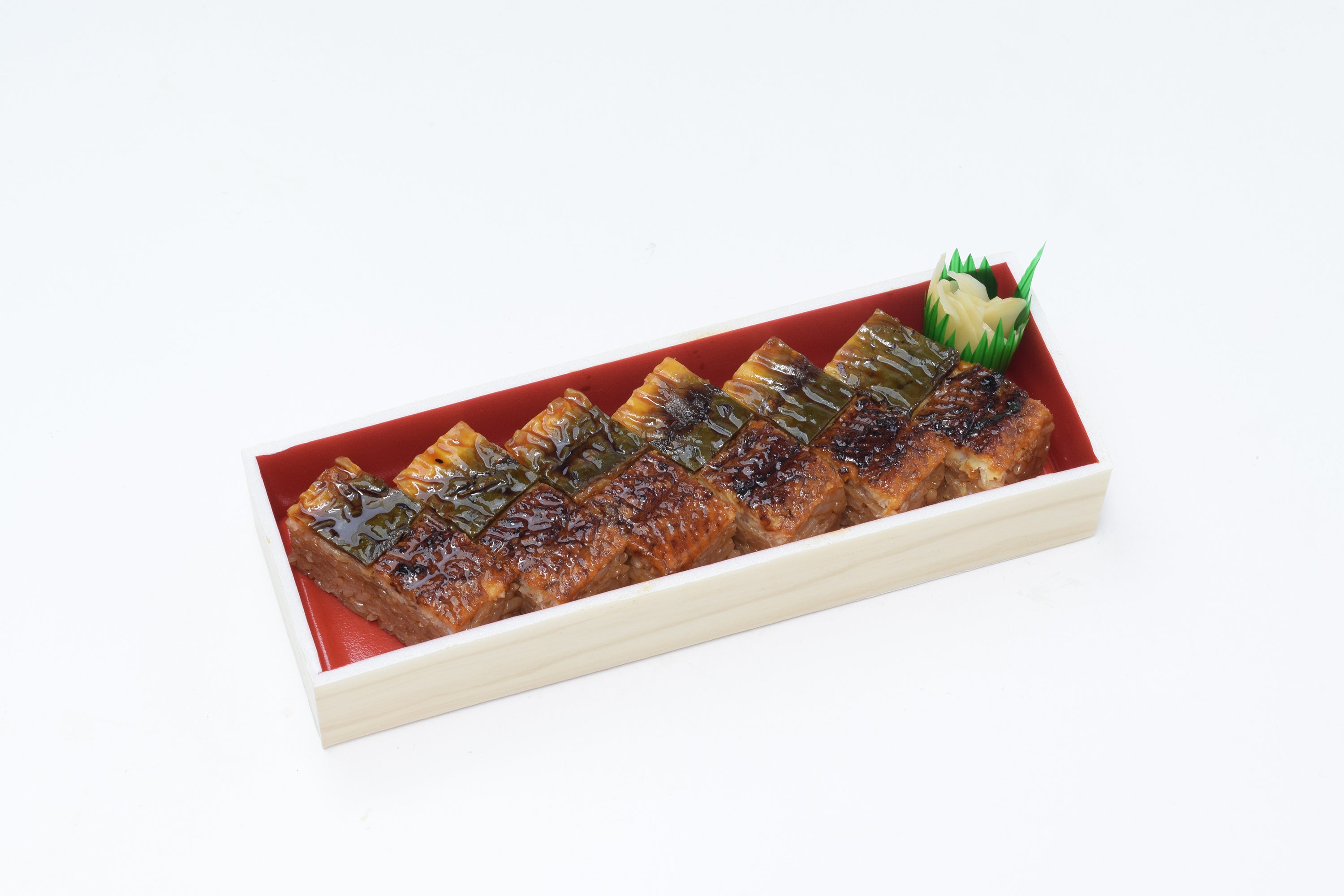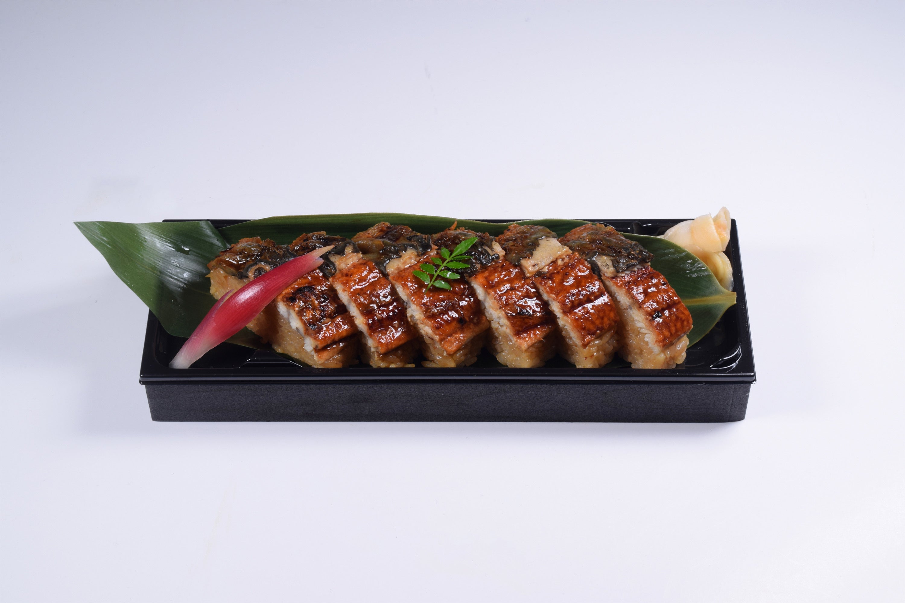 ◯商品説明 脂がのったうなぎの蒲焼を使用し、煮詰めた甘だれを舎利に合わせ押寿司に仕上げた一折です。