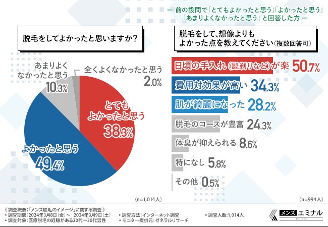 そこで今回、メンズ専用脱毛クリニック「メンズエミナル」(https://mens-eminal.jp/lp/?refmedia=31073)は、医療脱毛の経験がある20代~30代男性を対象に「メンズ脱毛施術前後のイメージ」に関する調査を実施しました。