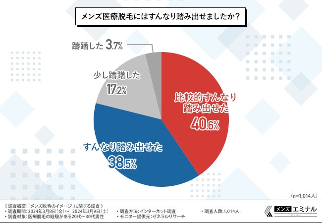 次に「メンズ医療脱毛にはすんなり踏み出せましたか?」と質問したところ、『比較的すんなり踏み出せた(40.6%)』『すんなり踏み出せた(38.5%)』『少し躊躇した(17.2%)』『躊躇した(3.7%)』という回答結果になりました。