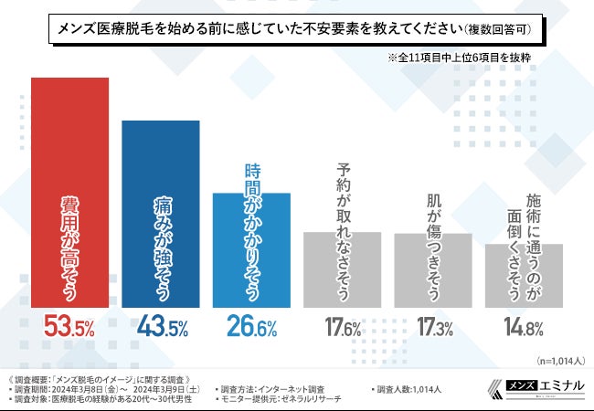 「メンズ医療脱毛を始める前に感じていた不安要素を教えてください(複数回答可)」と質問したところ、『費用が高そう(53.5%)』と回答した方が最も多く、次いで『痛みが強そう(43.5%)』『時間がかかりそう(26.6%)』と続きました。