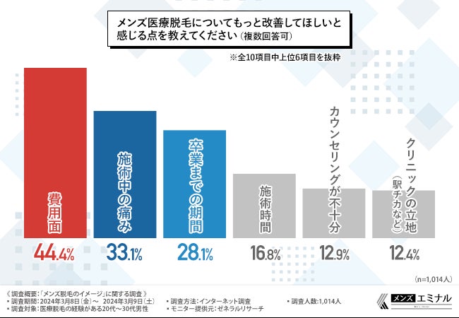 「メンズ医療脱毛についてもっと改善してほしいと感じる点を教えてください(複数回答可)」と質問したところ、『費用面(44.4%)』と回答した方が最も多く、次いで『施術中の痛み(33.1%)』『卒業までの期間(28.1%)』と続きました。