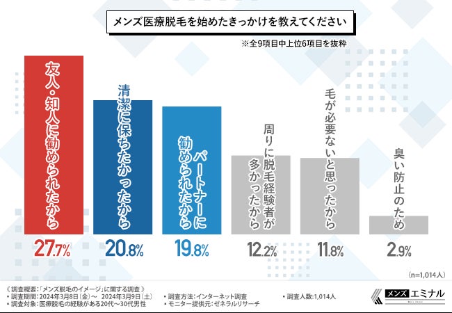 はじめに、「メンズ医療脱毛を始めたきっかけを教えてください」と質問したところ、『友人・知人に勧められたから(27.7%)』と回答した方が最も多く、次いで『清潔に保ちたかったから(20.8%)』『パートナーに勧められたから(19.8%)』と続きました。