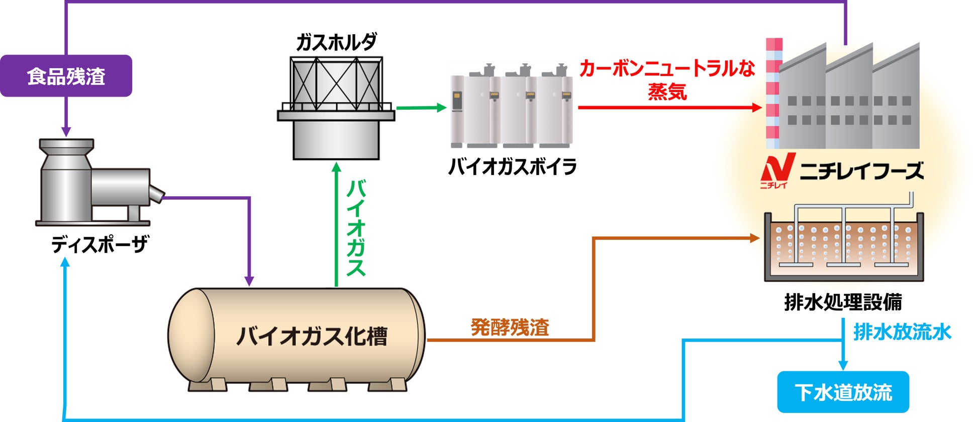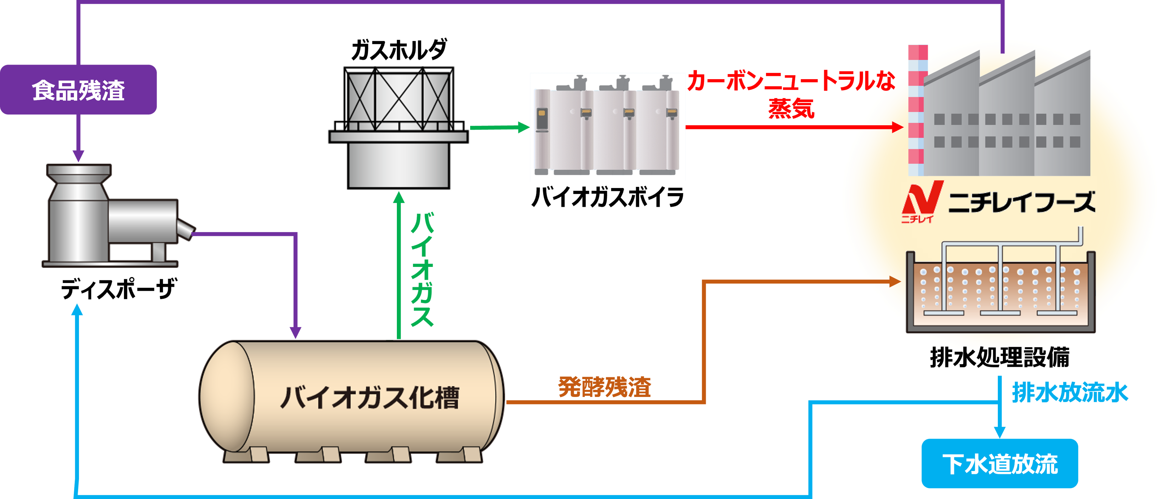 関西工場では「D-Bioメタン」により、食品残渣をオンサイトで発酵させ、メタンガスを製造します。そのメタンガスを燃料としてバイオガスボイラを運転し、カーボンニュートラルな蒸気を作り出し、自社工場敷地内で循環させ、製造工程で再利用します。