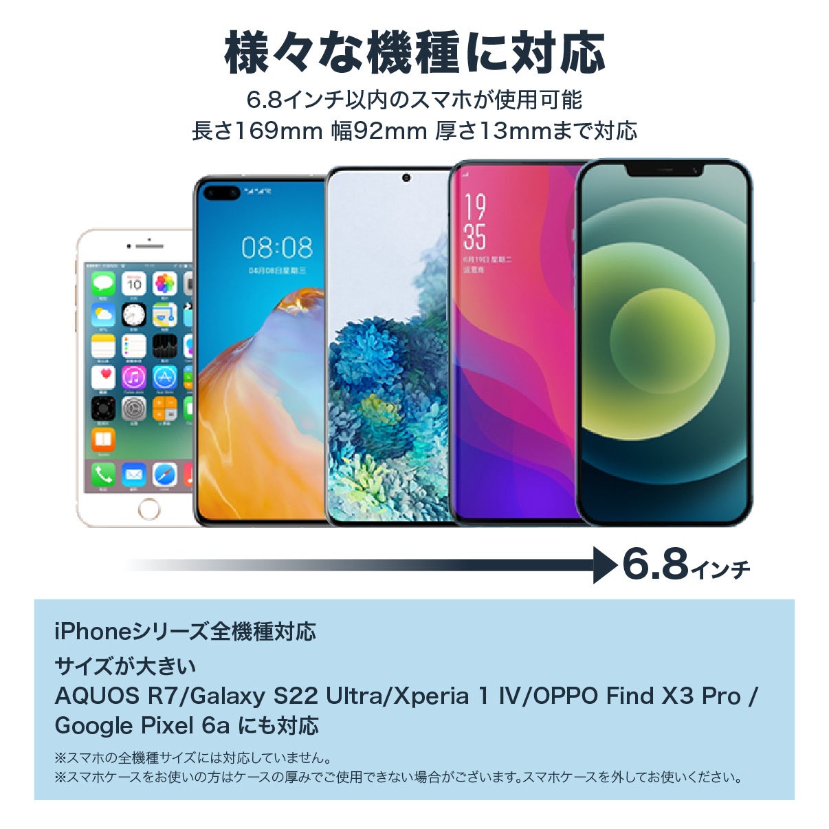 6.8インチ以内で長さ169mm 幅92mm 厚さ13mmまでのスマホが使用可能です。