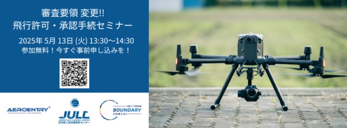 ドローンの関連許認可申請とソリューション開発を専門とするバウンダリ行政書士法人(本社:東京都千代田区、代表行政書士:佐々木 慎太郎)は、無人航空機の操縦に関する教育、指導および資格認定や登録講習機関として国家資格向け講習を展開する日本無人航空機免許センター株式会社(本社:東京都千代田区、代表取締役:松本 篤史、以下 JULC)およびエアロエントリー株式会社(同左)と共同でライブ配信オンラインセミナー「審査要領 変更!飛行許可・承認手続(DIPS2.0)セミナー」を、2025年5月13日(火)13:30より開催いたします。