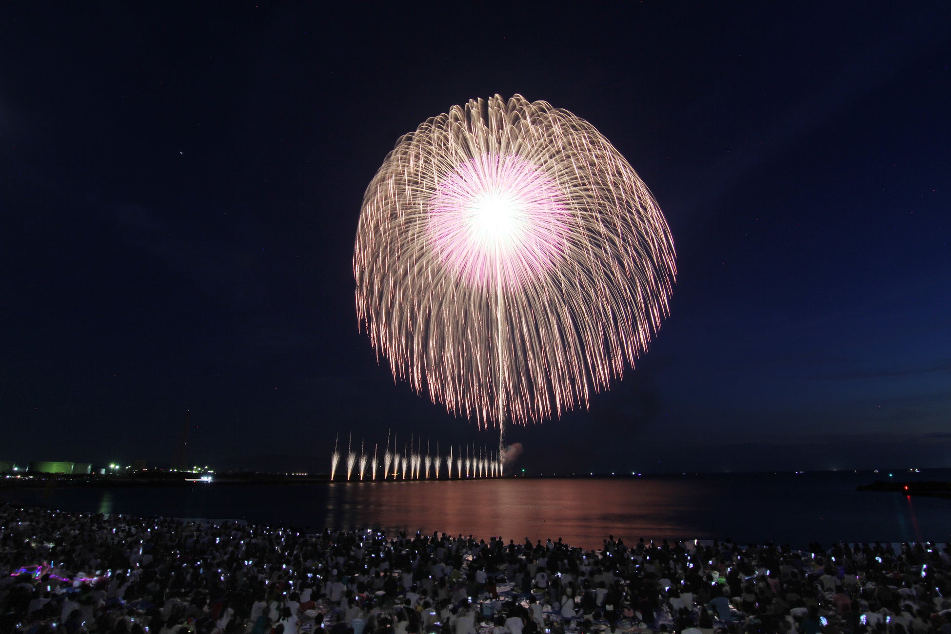 「三国花火大会」は例年山の日(祝日)である8月11日に福井県坂井市の三国サンセットビーチにて開催される北陸最大の名にふさわしい大花火大会です。県内外からたくさんの方が来訪され、昨年は20万人以上の方にお越しいただきました。三国花火大会の名物といえば、水中花火。三国花火大会では船から火をつけた花火玉を花火師が直接海へ投げ込んでいます。かなり危険を伴う花火ですが、綺麗な半円を描く美しい花火を皆様にご覧いただけるよう力を尽くしています。他にも見どころたくさんの三国花火大会を場所取り不要の有料観覧席でゆっくり鑑賞し、ひと夏の思い出を作ってください。