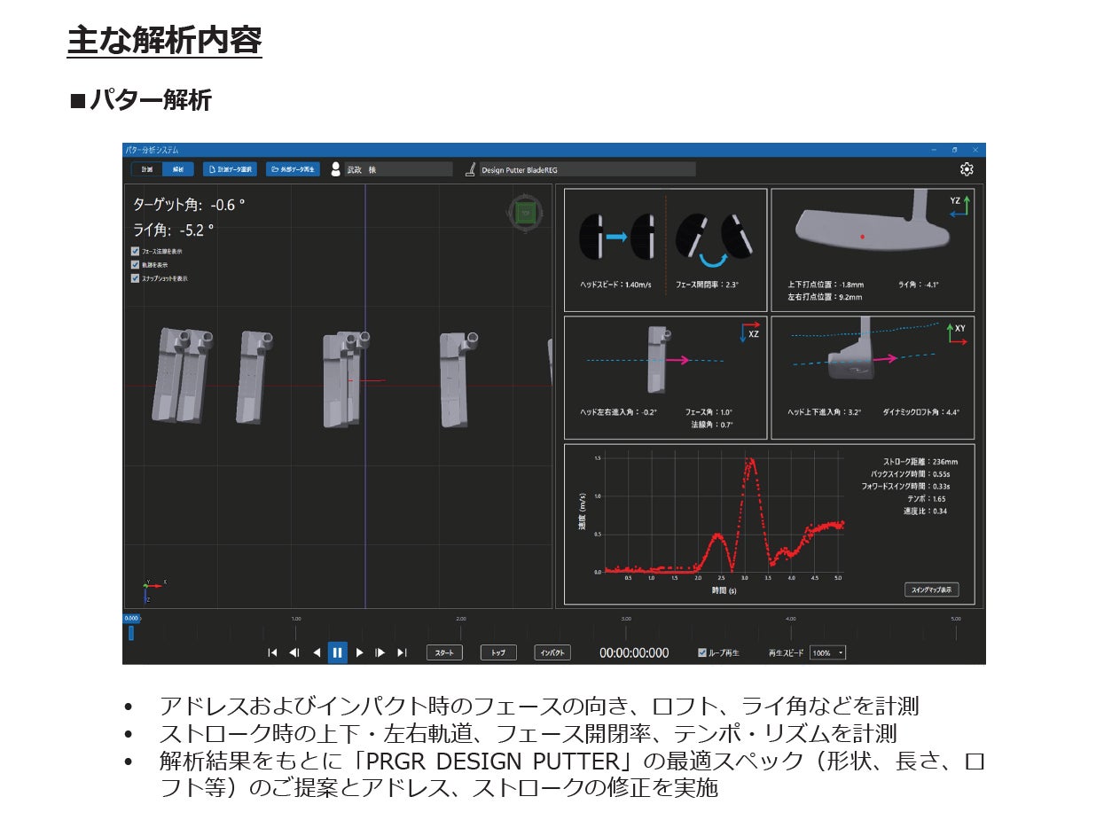 「ショートゲーム解析コース」は、プロギアが新たに開発したライブ機能搭載のモーションキャプチャカメラ7台からなるヘッド挙動測定器を使用し、アドレス、ストローク、インパクトにおけるフェースの向きを高精度に可視化。PRGR 認定インストラクターが解析結果とストローク、フェースの開閉や角度をリアルタイムで確認しながら、お客様のショートゲームスキルの向上をサポートします。また、こうした解析結果からお客様に最適な「PRGR DESIGN PUTTER(プロギア・デザイン・パター )」のフィッティングやウェッジのご提案も可能です。