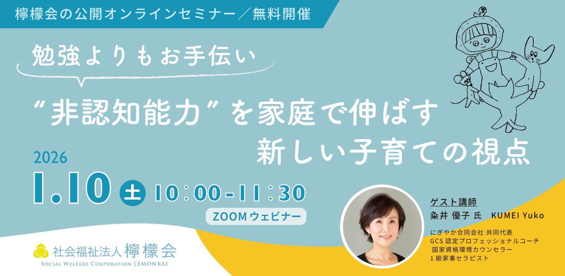 「レイモンドほいくえん」「れもんのこほいくえん」などの保育施設を運営する社会福祉法人檸檬会が、2026年1月10日(土)にオンラインセミナーを無料で開催します。今回はゲスト講師に粂井 優子さんをお招きし、子どもの自立・自己肯定感を育む「お手伝い・家事」の力についてお話いただきます。新しい年の始まりに、子どもの “生きる力” を家庭で育むヒントを、一緒に学びませんか?