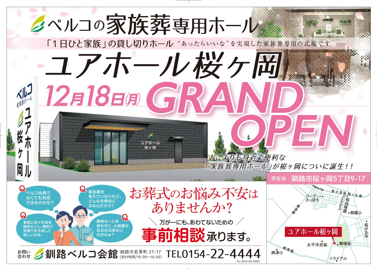 人生の二大行事である「冠婚葬祭」を、互助会という助け合い事業を通じて、お手伝いしてきた株式会社ベルコ(本社:大阪府池田市、代表取締役社長:齋藤 斎、以下「ベルコ」)は、昨今の家族葬ニーズの高まりに対応し、「1式場1組貸切り」のリビング型葬儀場「ユアホール桜ヶ岡」を2023年12月に北海道釧路市桜ヶ岡にグランドオープンいたします。