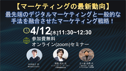国内最大級パブリックDMPを提供するデータプラットフォームカンパニーの株式会社インティメート・マージャー(本社:東京都港区、代表取締役社長:簗島 亮次、以下当社)は、マーケティングの側面から事業成長を支援する株式会社unnname(本社:東京都渋谷区、代表取締役:宮脇 啓輔、以下:unname社)と共催セミナー「【マーケティングの最新動向】最先端のデジタルマーケティングと一般的な手法を融合させたマーケティング戦略!」を2023年4月12日(水)11時30分より実施することをお知らせします。