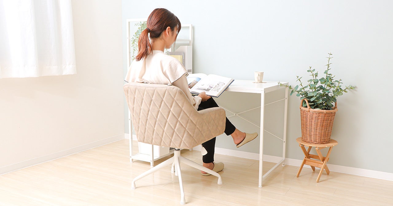 デスクチェアと同じく、360度回転します。座ったままくるっと向きを変えられるので、限られたスペースでも椅子を引かずに出入りが出来ます。