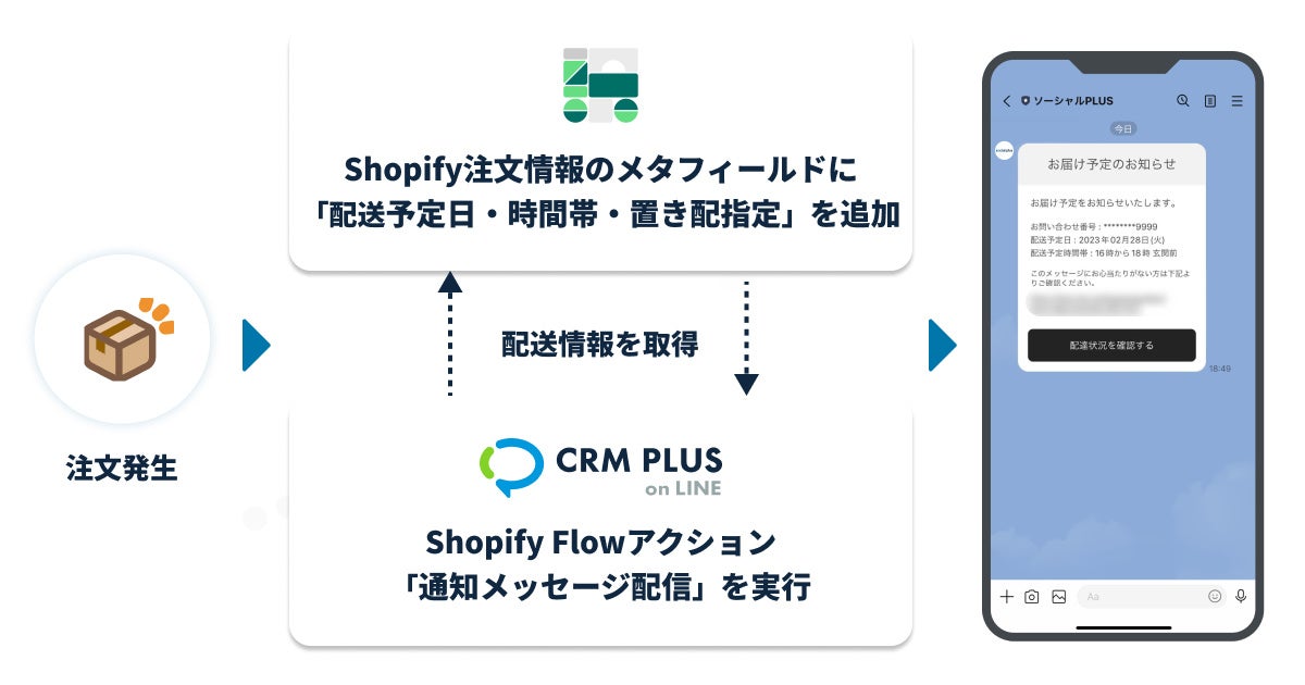 これにより、Shopifyでストアを運営しているマーチャントは、「CRM PLUS on LINE」と「配送日時指定.amp」アプリを使うことで、配送予定日・時間帯・置き配指定などが記載された発送通知をLINE公式アカウントで配信可能になりました。電話番号でマッチングして配信するため、LINEの友だち追加がされていない方にも配信可能です。