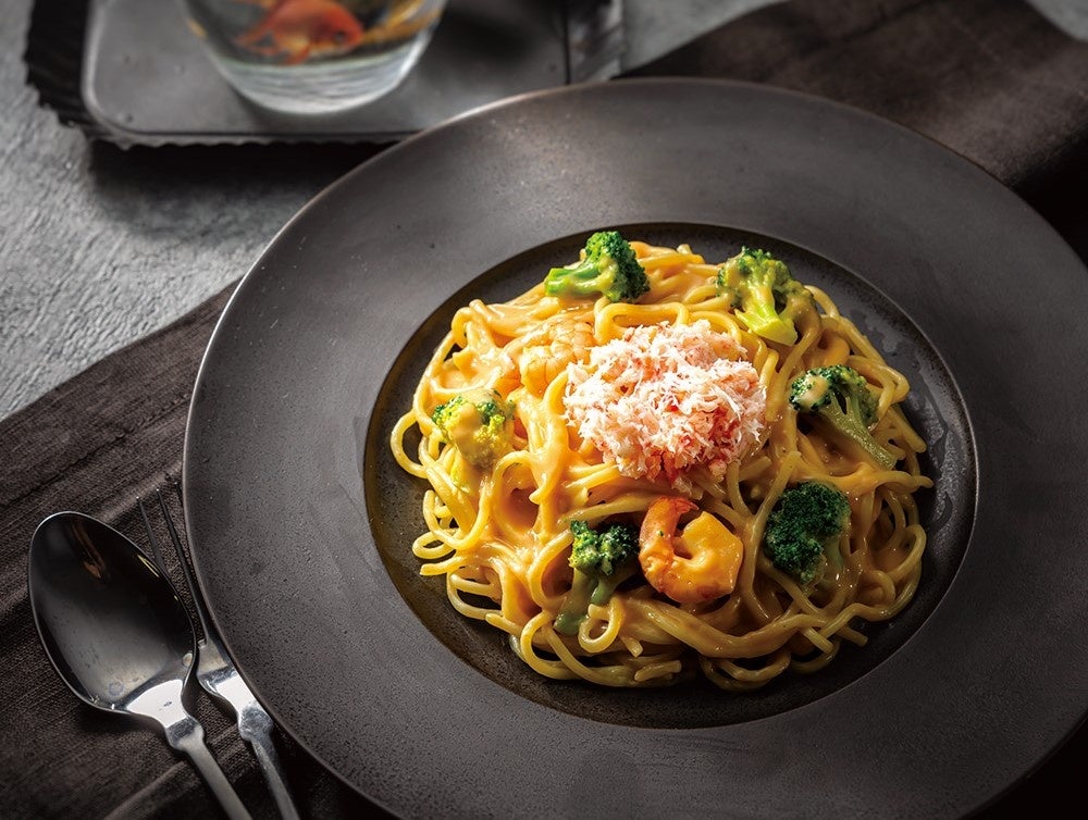 「紅ずわい蟹とエビの濃厚ロブスタークリームパスタ」は、濃厚でクリーミーな味わいのロブスターのクリームやボイルしたエビ、さらにふわっとした食感で舌触りが良く、旨味が凝縮された少し甘味のあるジューシーな紅ずわい蟹といった魚介の旨味を一度に感じられるメニュー。クリームには、隠し味として醤油やコンソメスープ、旨味が凝縮された蟹のソースを加えることでよりロブスターの味わいを引き立たせつつ、濃厚で香り豊かなパスタへと仕上げています。