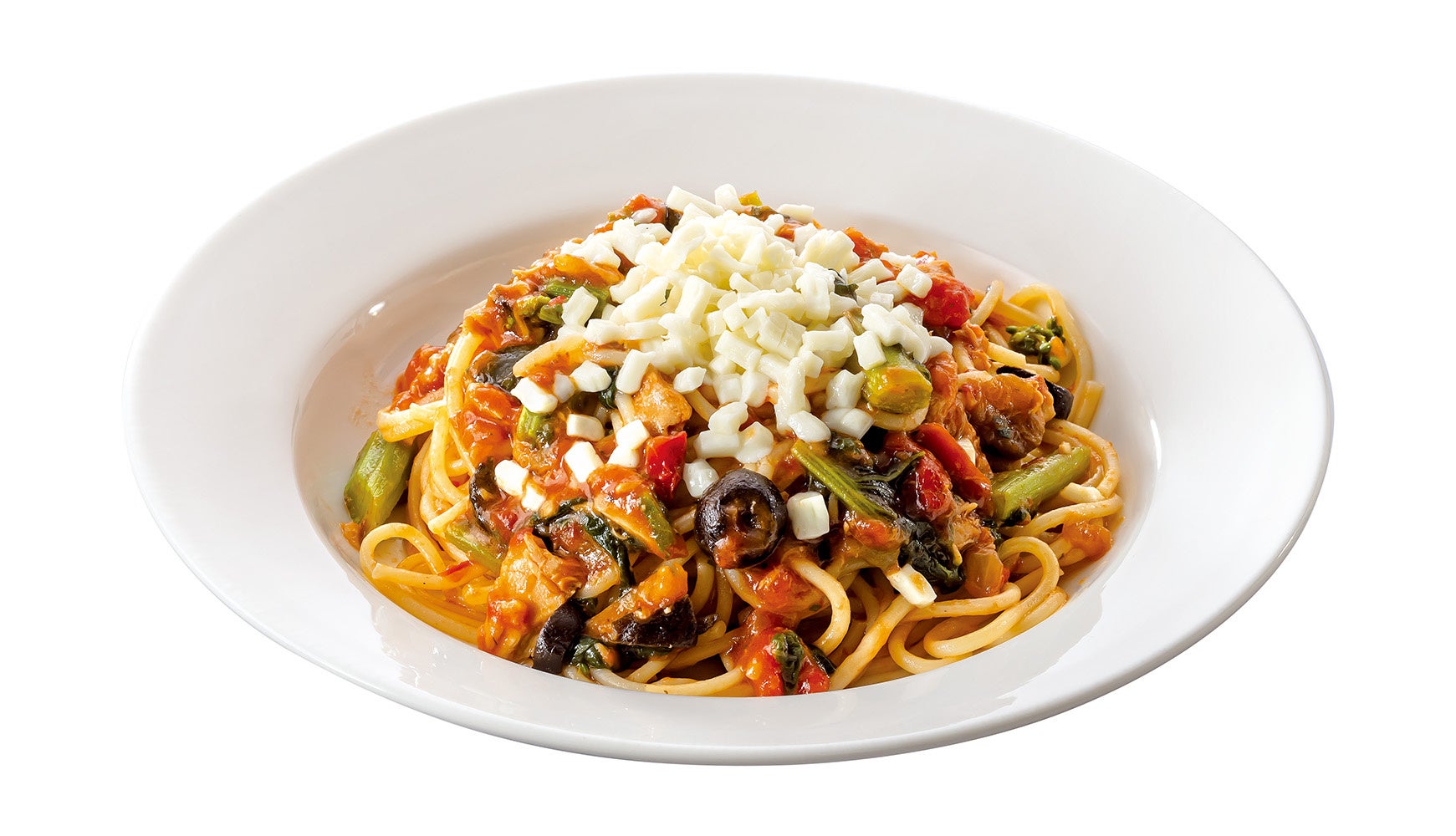 ジューシーなオリジナルトマトソースとグリル野菜の組み合わせがたまらない「モッツァレラとグリル野菜のトマトソースパスタ」も同時発売!