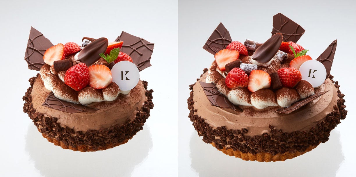 ふわっと軽い口当たりの生チョコクリームで表面をコーティングし、とろける生チョコレートと生クリーム、甘酸っぱいイチゴやチョコレートで華やかに飾りました。