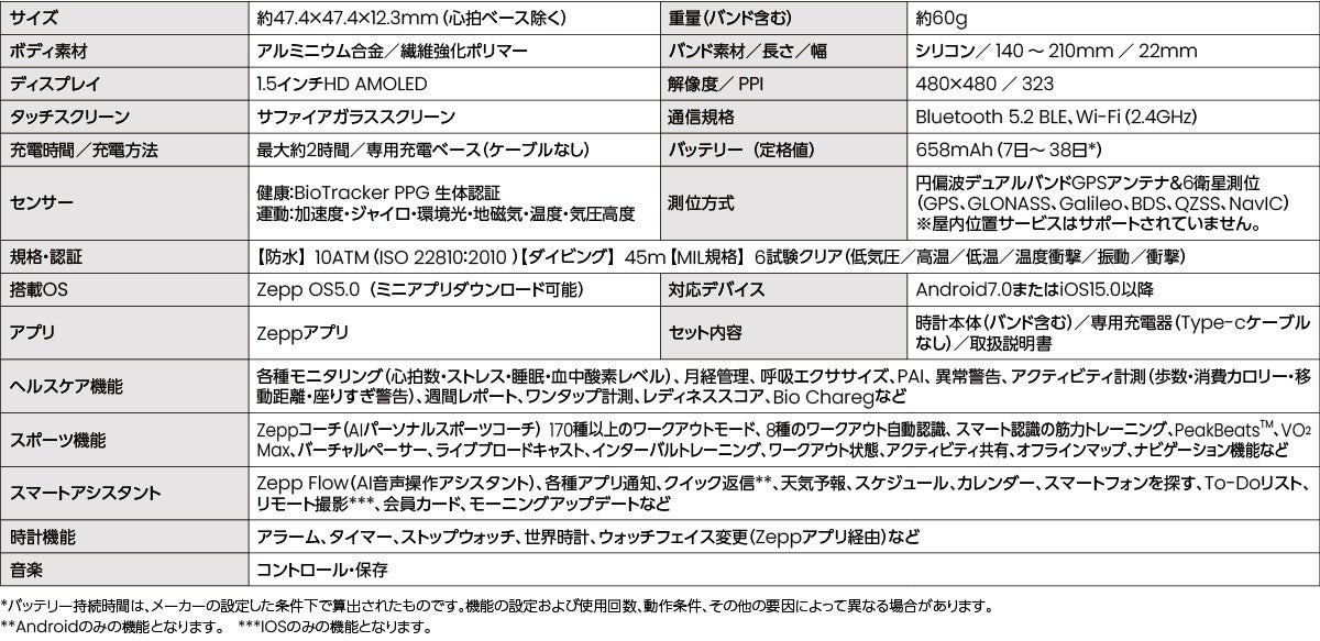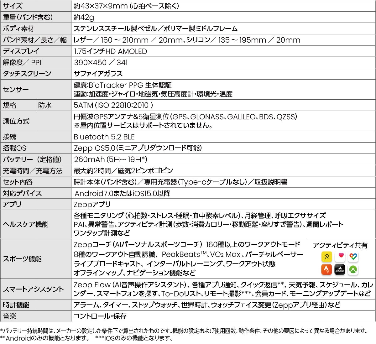 ●製品仕様について、詳しくは Amazfit 公式ウェブサイトをご覧ください。