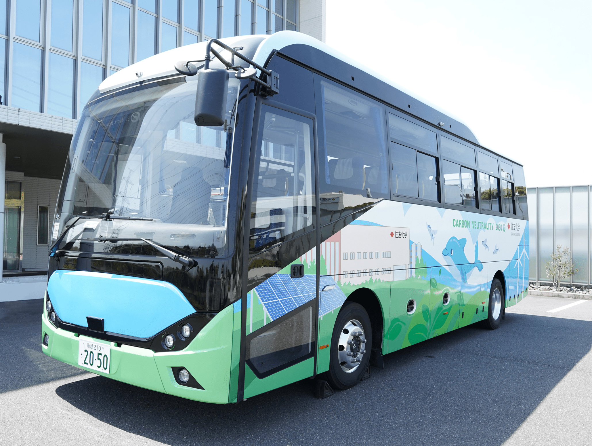 住友化学様は2050年のカーボンニュートラル実現へ向けた様々な取り組みに注力されており、その一環として、千葉工場の通勤バス及び工場間の移動用バスとして中型観光EVバスを導入されております。