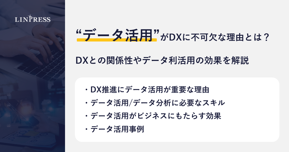 企業向けDX人材育成研修を提供する株式会社リンプレス(本社:東京都港区、代表取締役社長:三宮壮、以下、リンプレス)は、DXに取り組む企業様に向けて、『「データ活用」がDXに不可欠な理由とは?その関係性と期待できる効果を解説』と題した記事を公開しましたので、お知らせします。